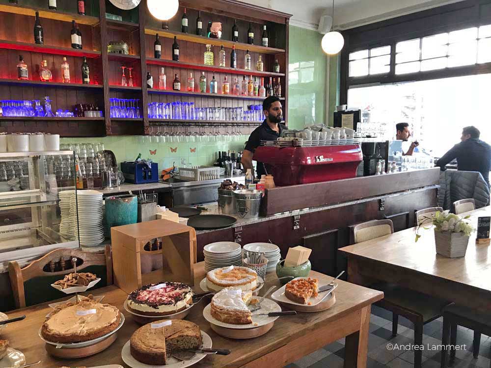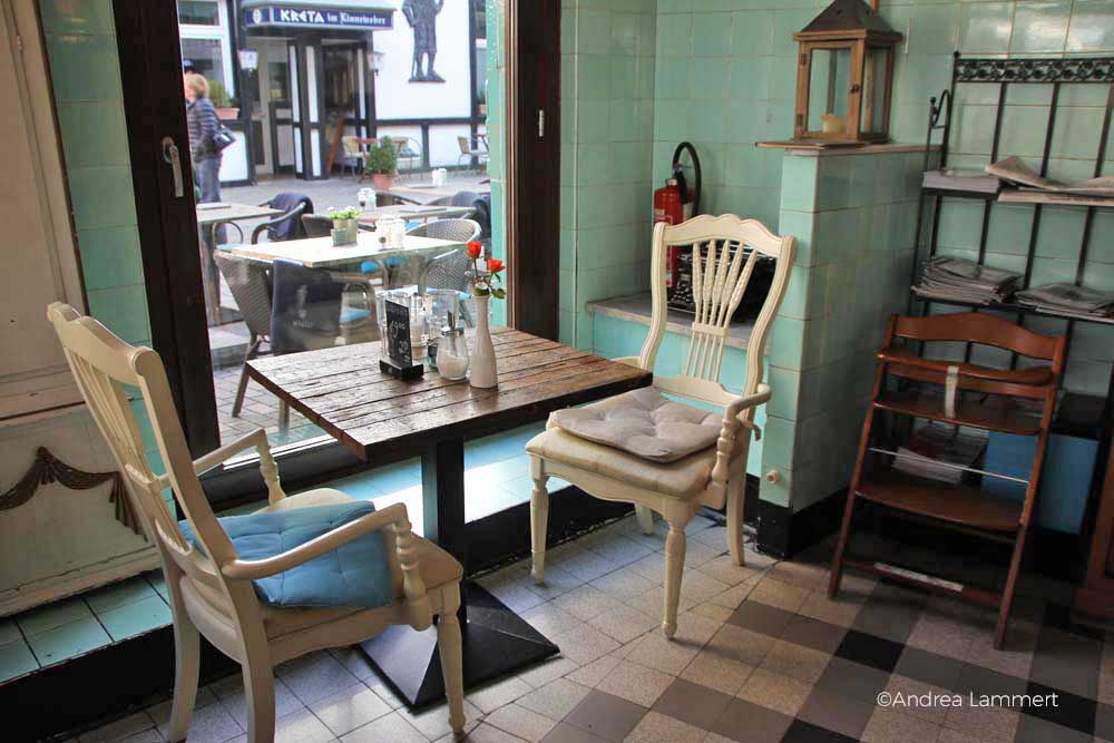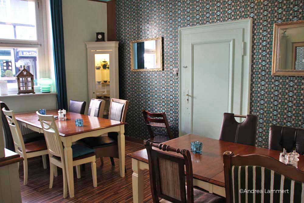 Ein Mix aus verschiedenen Möbeln versprüht ein wenig Upcycling-Atmosphäre im antiken Shabby-Look. Herzstück des großen Raumes ist ein neun Meter langer Tisch. In den Fensternischen und im Seitenraum befinden sich noch alte Stücke aus der Zeit, als das Haus ein Lebensmittelladen war, etwa eine alte Waage. Das alles sorgt für eine ganz besondere Stimmung. Am Ende des Tresens wartete ein riesiges Kuchenbuffett auf seine Abnehmer und, was ich besonders toll fand, für knapp sieben Euro gab es Kuchen und Kaffee satt, man konnte so viel essen, wie man eben konnte.