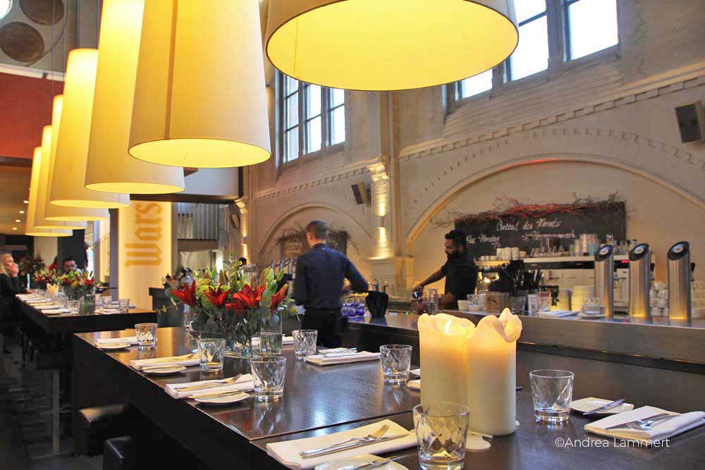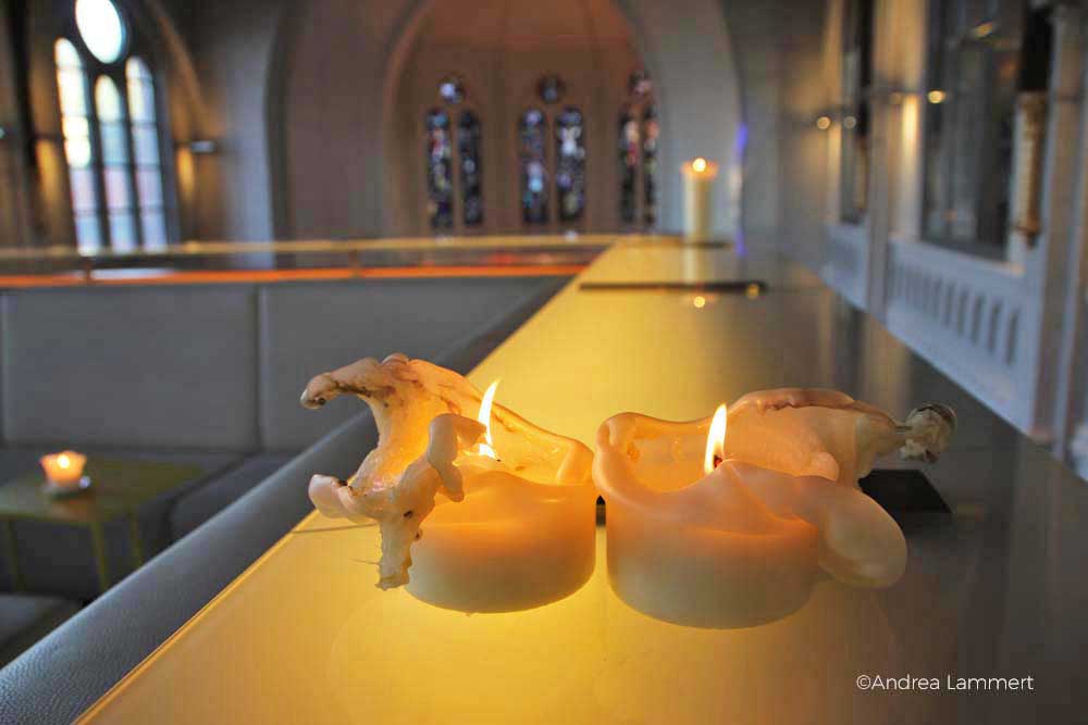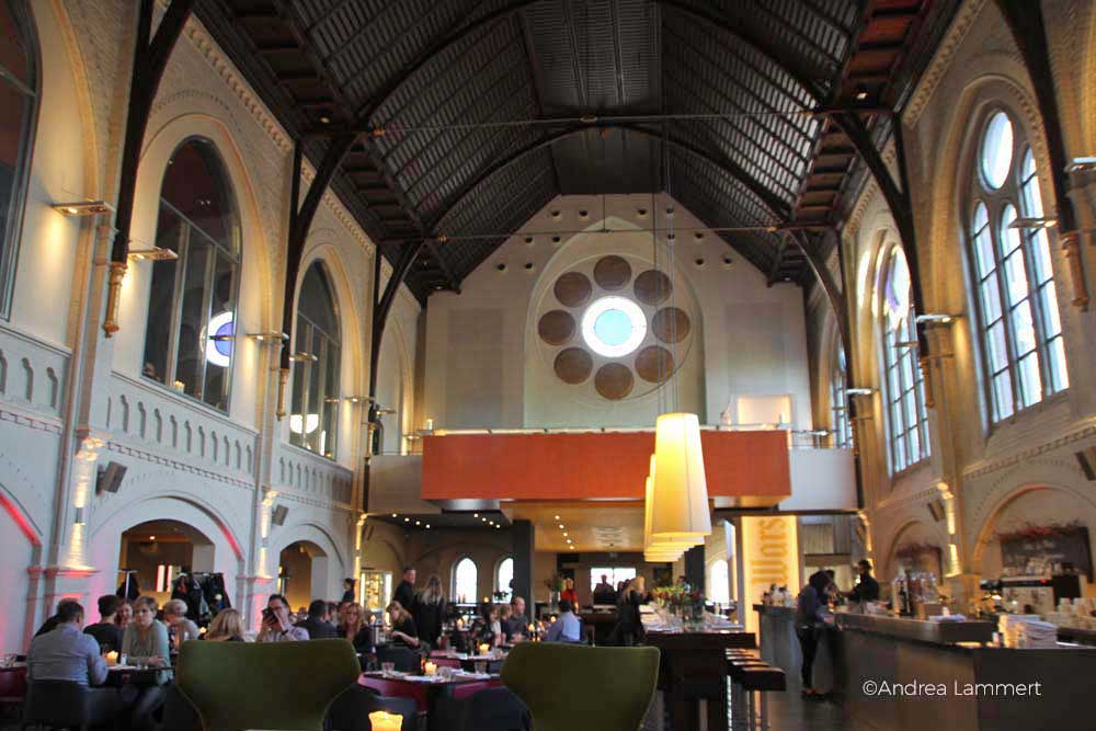 Doch trotz aller Schönheit konnte die Gemeinde das Gebäude nicht mehr nutzen. Also entschloss sich die Kirche letztendlich, den Bau einem Gastronomen zu übergeben, der der Kirche mit seinem ungewöhnlichen Konzept zu neuem Leben verhelfen wollte. Sie wurde säkularisiert und feierlich entweiht. 2005 eröffnete dort das neue Restaurant und sorgte über die Stadtgrenzen hinaus für Furore mit der Kirche, in der man nun brunchen, trinken und chillen konnte, anstatt Orgelklängen und Predigen zu lauschen. Während wir im Altarbereich in einem Halbrondell sitzen, eröffnet sich vor uns ein langer Saal, in dem sich die Tische aneinander reihen. Doch das Sympastischte fand ich die Nischen, links neben dem Altar, dort ist ein Kinderspielbereich untergebracht, kuschelig, bereit zum Toben und ein eigenes, kleines Reich. Während das Kirchenschiff eher Bistroküche serviert, gibt es oben einen abgetrennten Bereich, in dem noch mal eine Spur feiner gespeist werden kann. Und sogar eine Bar in verschieden farbene Lichtspiele gehüllt, gibt es in dieser Kirche.