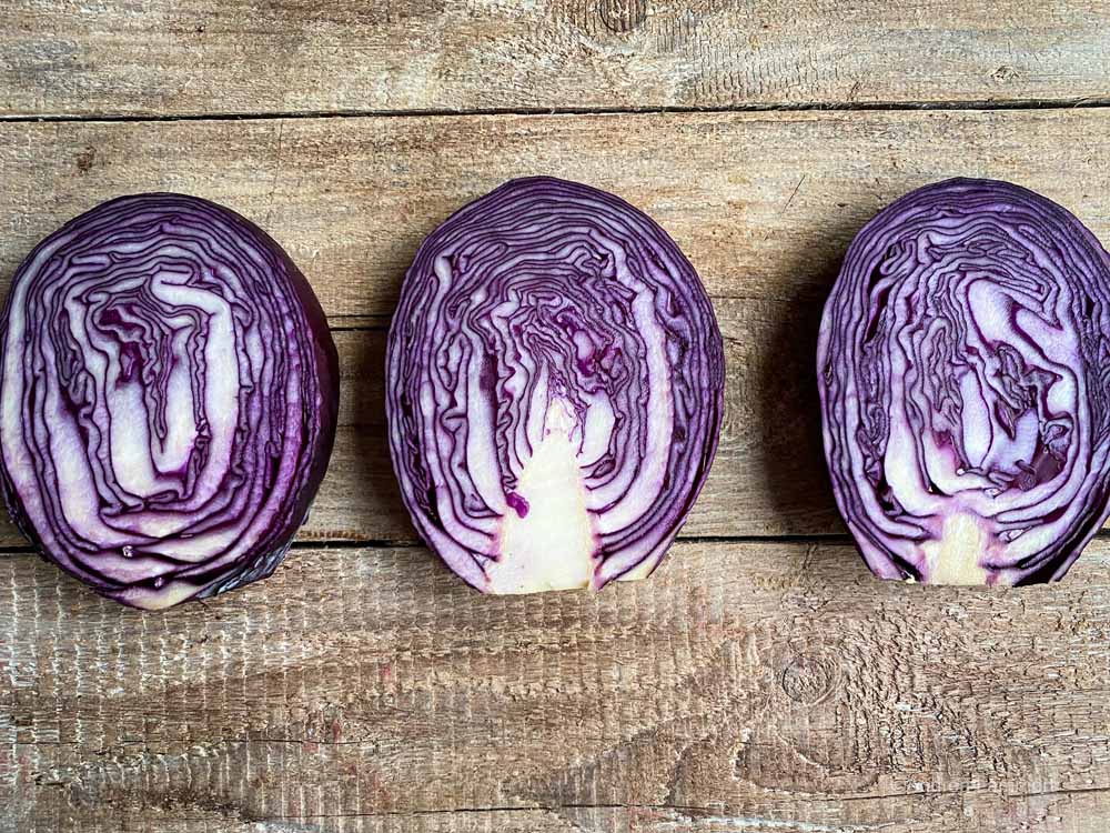 Den Rotkohl in fingerdicke Scheiben schneiden und darauf achten, dass die Scheiben nicht auseinanderfallen. Backblech mit Backpapier auslegen und Scheiben hinauf legen. Pro Person rechne ich ein Rotkohlschnitzel.