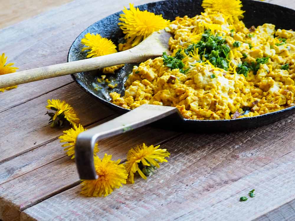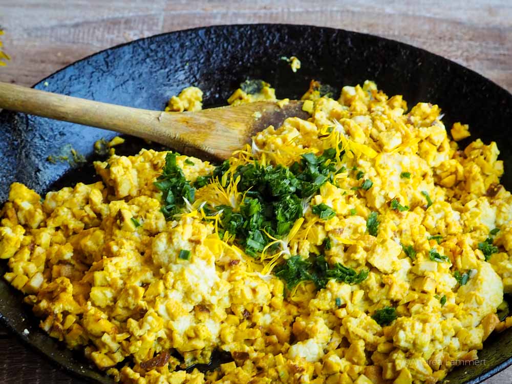 Dann brätst du es weiter in der Pfanne und rührst den Seidentofu unter. Alles nimmt in der Wärme eine wunderbar gelbe Farbe an. Zum Schluss gibst du gehackte Frühlingszwiebeln auf das Rührei. Ich hebe immer noch die Blütenblätter des Löwenzahns unter, nur das Gelbe. Stängel und alles Grüne schmeckt enorm bitte und das muss man mögen. Fertig ist der Rührtofu.