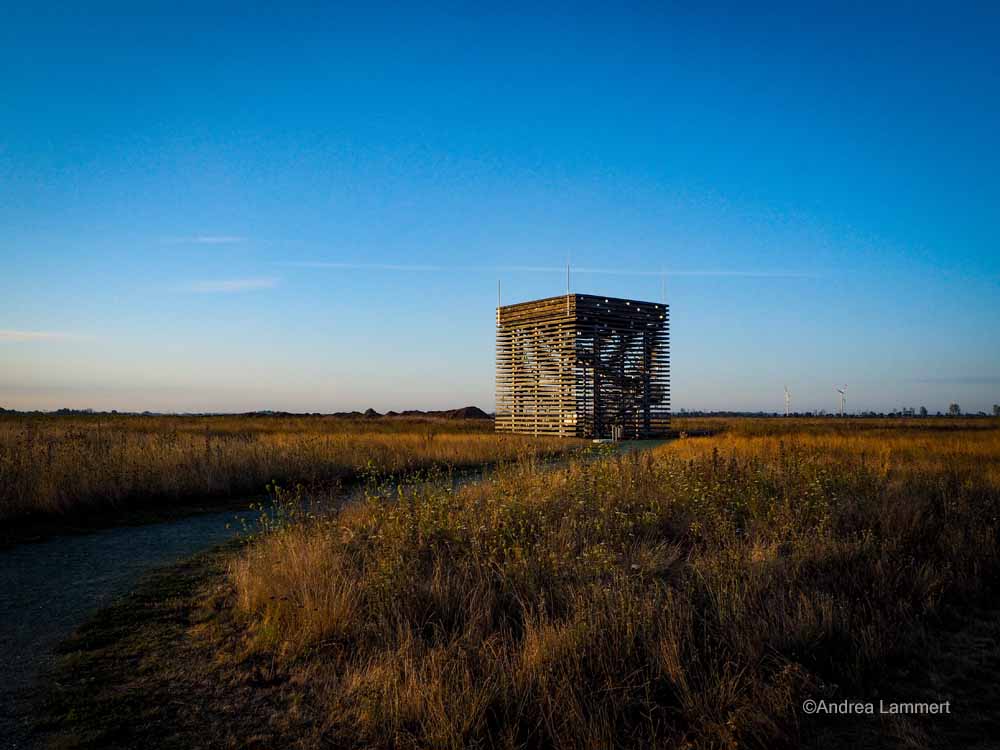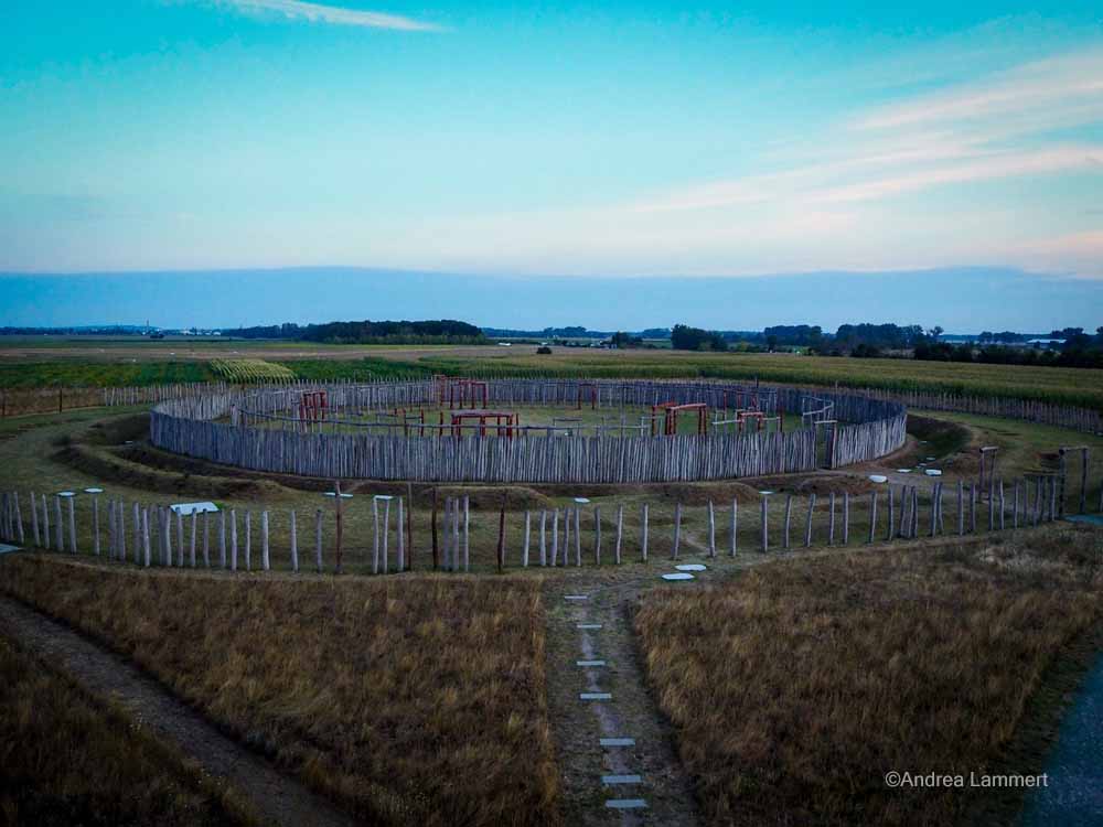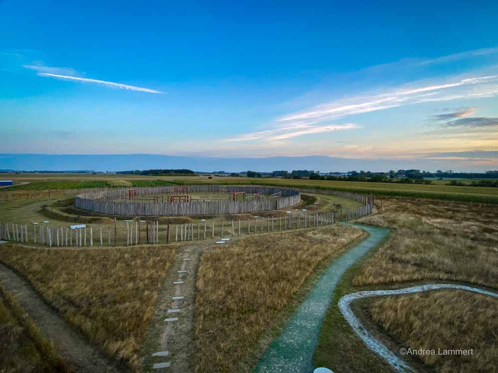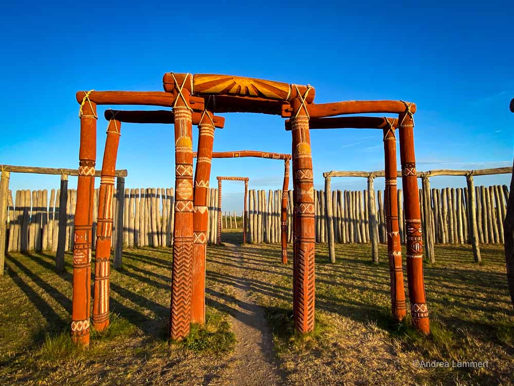 Nun kaufe ich durch das Gras in Zackmünde laufe und sauge den Spätsommermorgenduft in meine Nase. In meinem Blickfeld ragt ein quaderähnliches Holzgebäude auf, es ist der Aussichtsturm, von dem aus man den Blick auf den alten Kultplatz hat. Dort zeigt sich, wie rund die Anlage aufgebaut wurde und dass es mehrere Ringe gibt, die einander einschließen. Es ist erstaunlich, wie kreisrund die Formen sind, wenn man bedenkt, dass sie vor mehr als 5000 Jahren geplant worden sind, damals gab es weder Drohnen noch Türme.