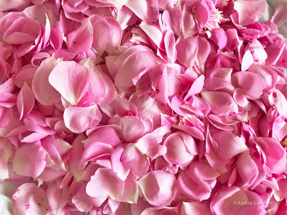 Wer diesen Sirup machen möchte, sollte auf jeden Fall eigene Rosen im Garten haben oder wen kennen, der eigene Rosen im Garten hat. Gekaufte Blüten aus der Blumenhandlung gehen auf gar keinen Fall, sie sind viel zu sehr gespritzt. Außerdem geht ihr Duft leider meistens gen Null. Möglicherweise geht es auch mit Freilandrosen, dann aber sollte man den Händler seines Vertrauens fragen, ob die Rosen gespritzt sind. Heckenrosenblüten sind auch etwas Wunderbares als Zutat, aber da die Blüten nicht gefüllt sind, braucht man ganz schön viele. Und da regt sich schon mein schlechtes Gewissen, weil ich denke, dass ich den Hummeln und Bienen zu viele Blüten wegnehme. Gezupft werden die Blütenblätter am liebsten mittags, da sie dann ihr volles Aroma versprühen und auch der geschmackbringende Zuckergehalt am höchsten ist.