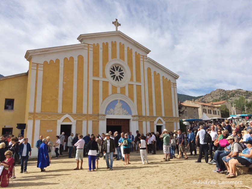 Dieser Gesang geht durch und durch. Mir jedenfalls fährt er voll unter die Haut. Und wenn ich mich auf dem großen Platz vor der Kirche von Casamaccioli so umsehe, sind auch viele meiner Umstehenden fasziniert von dieser Stimme. Kein Rock, kein Pop, es ist „Kyrie eleison“, das mich derart in den Bann zieht. Ich schaue auf die Gänsehaut auf meinem Arm und schüttele innerlich den Kopf, dass ausgerechnet Kirchenmusik diese Wirkung auf mich hat. Mein Wundern dauert nur kurz. Viel zu mitreißend ist die fromme Anrufung der neun Männer, wenn sie ihr „Herr erbarme dich“ an Santa di u Niolu singen. Es ist der Auftakt zum großen Gottesdienst, in dem gleich auch der Bischof von Ajaccio, Olivier de Germay, predigen wird. Er steht schon vor der Bühne, ganz in festlicher blauer Robe gekleidet und von einem Messdiener auf Schritt und Tritt mit einem quietschgelben Sonnenschirm beschattet.