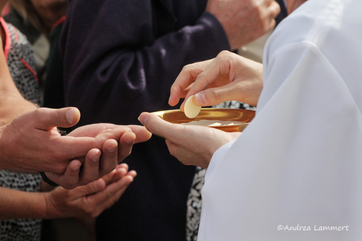 Die Menschen auf dem Platz hören ihm aufmerksam zu, drängen sich auf Mauern, sitzen auf Holzstühlen oder auf dem Boden. Anschließend verteilt er das Abendmahl, ruhig warten die vielen Gläubigen, bis ihnen die Hostie in die Hand gelegt wird.