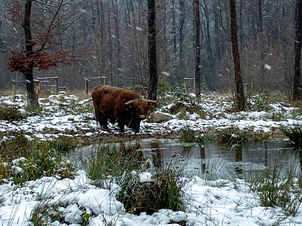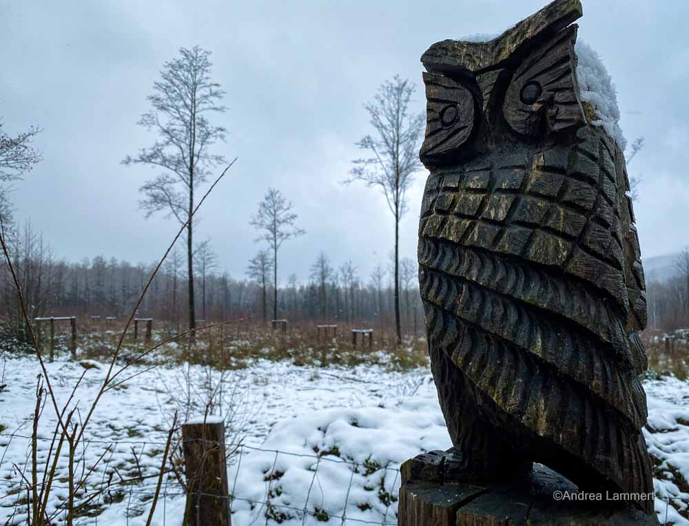 Doch weder frühes Morgenlicht noch Pferde gab es auf meiner Tour gestern, dafür die Rinder. Ein schottisches Rind ist aus dem Gebüsch getreten und zu seiner Wasserstelle getrottet. Ein schönes Bild, das sich immer lohnt, innezuhalten und zuzuschauen. Während es an dieser Stelle des Spaziergangs noch gar nicht nach viel Schnee aussah, sondern eher nach einem sparsamen Hauch, ändert sich das im Laufe der Tour. Am Ende des Rindergeheges biege ich links ab gen Sennhütte und der Weg nimmt Steigung auf. Mit jedem Schritt scheint sich auch die Schneemenge zu erhöhen. Da ist es endlich, das schönste Wintergeräusch, dieses Knirschen unter den Sohlen.