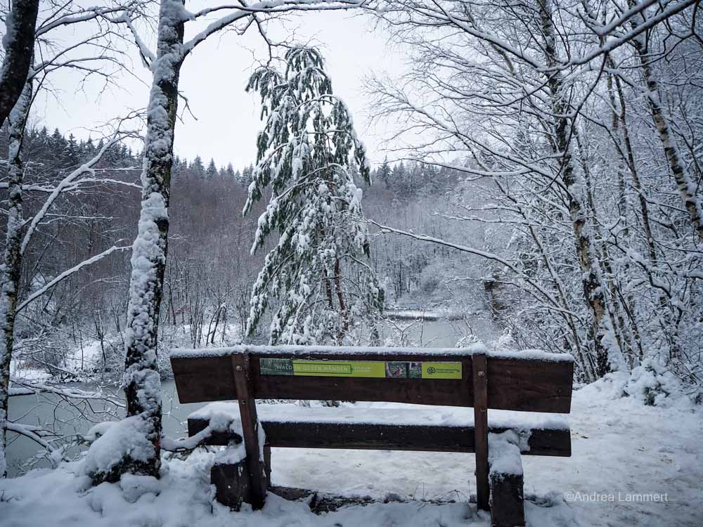Fichtenbestände wechseln sich mit Jungbuchen ab, meine Hündin und ich durchstreifen die Schneelandschaft. Schließlich gelangen wir zur Sennhütte, die momentan ja leider geschlossen ist. Dort gäbe es Leckereien wie Sennhüttenschmarrn oder Spätzle und Knödel. Also weiter, kurz hinter der Hütte heißt es rechts abbiegen. Dort beginnt ein Naturschutzgebiet namens St. Avold.