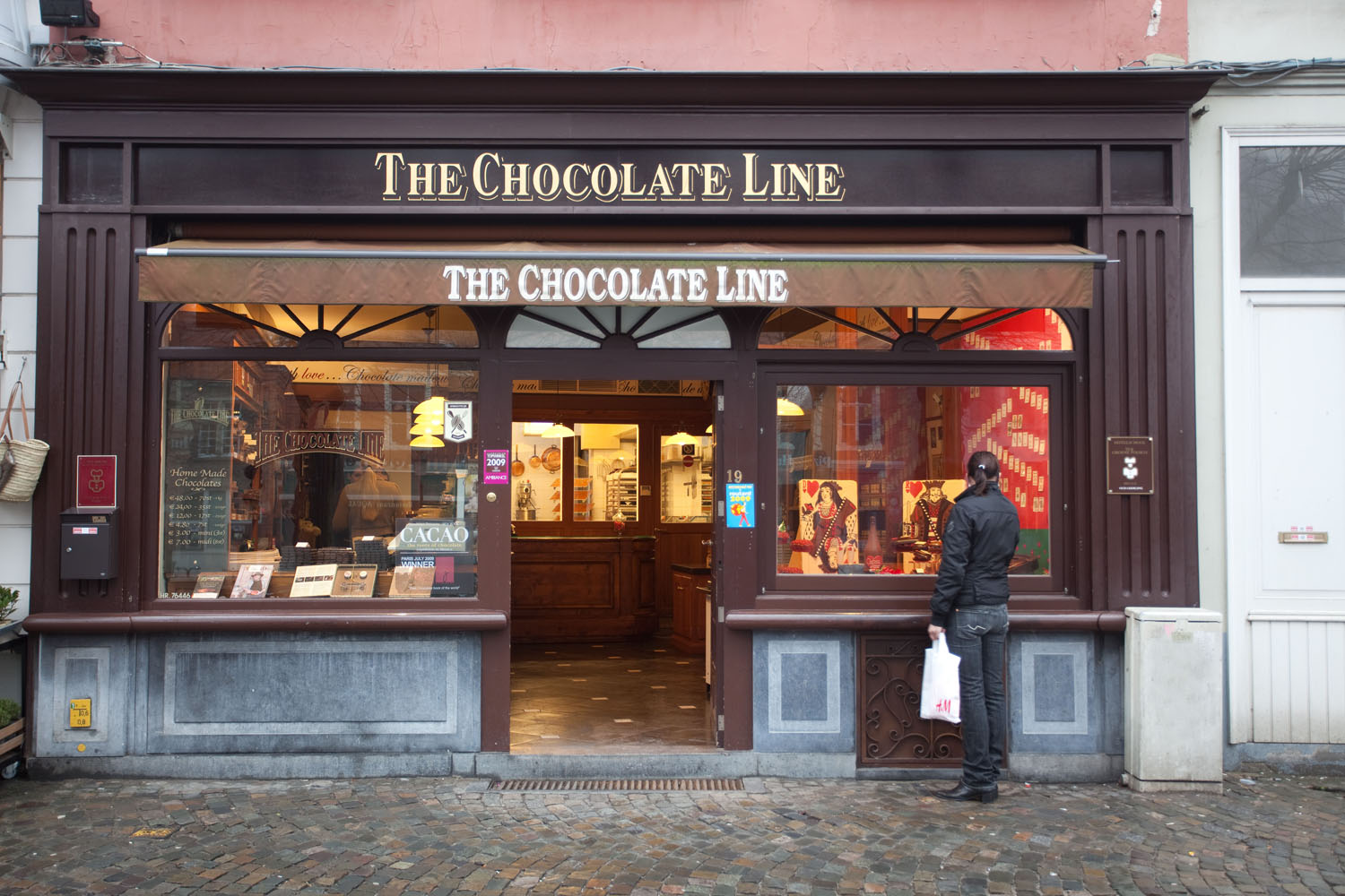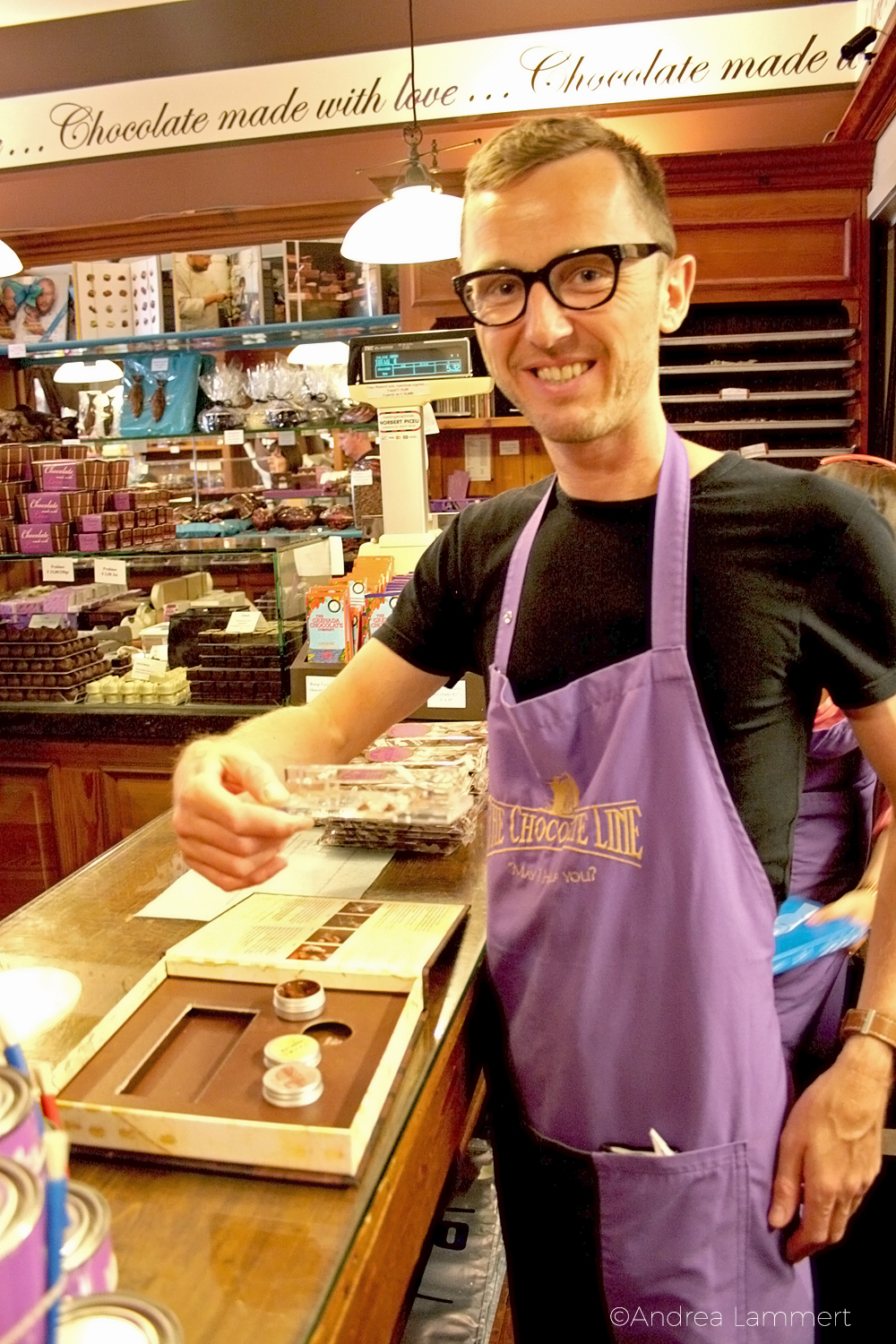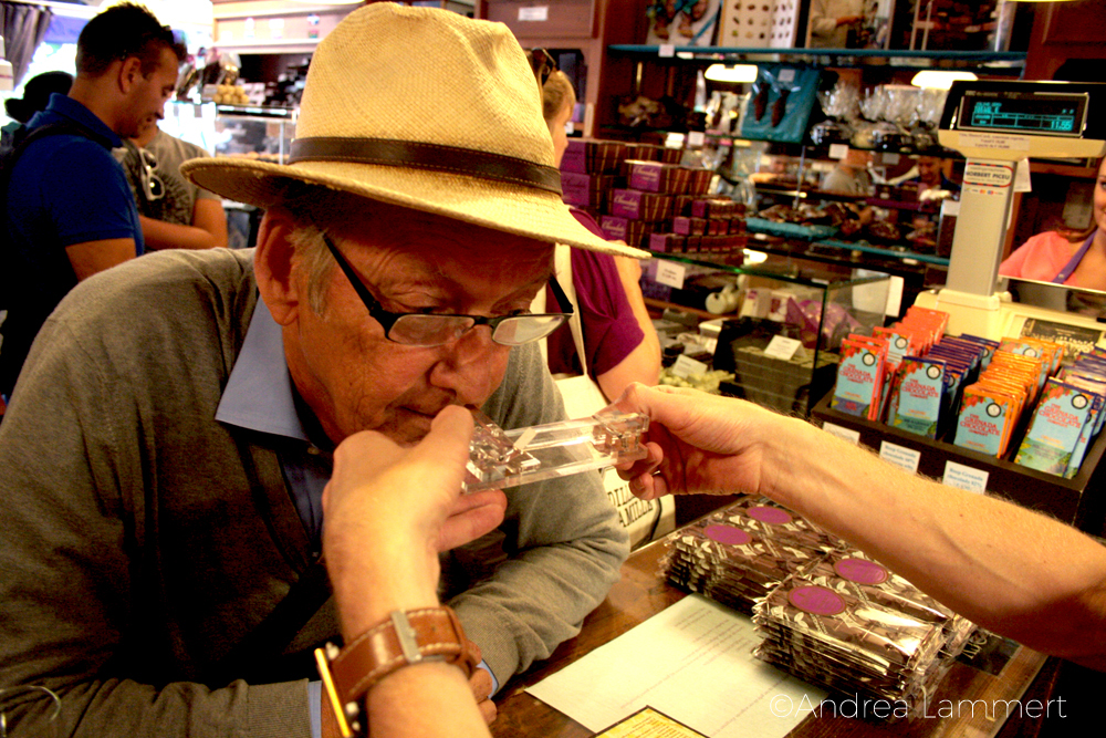 Die Menschen drängeln sich in dem kleinen Laden in der Brügger Innenstadt, der mit seiner dunklen Holzeinrichtung aussieht wie eine Apotheke. Statt der kleinen Fläschchen und Näpfchen türmen sich Tafeln in dunkelbraun, hellbraun und beige, Ich möchte eigentlich alles einmal probieren. Doch da kommt Geert Cumptich schon mit seiner speziellen „Maschine“ um die Ecke. „Damit gibt es Schokolade zum Koksen.“ Selbst mein Guide, Daniel Pieters, ist schon ganz aufgeregt. „Bin ich dann high?“ fragt er auf flämisch, das dem deutschen so ähnlich ist, dass man doch erahnen kann, was gesagt wird. Er muss warten, zuerst darf ich testen.