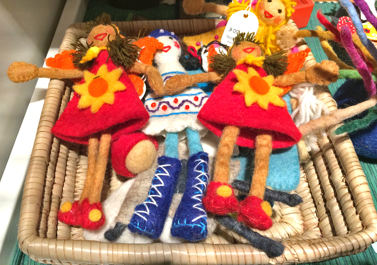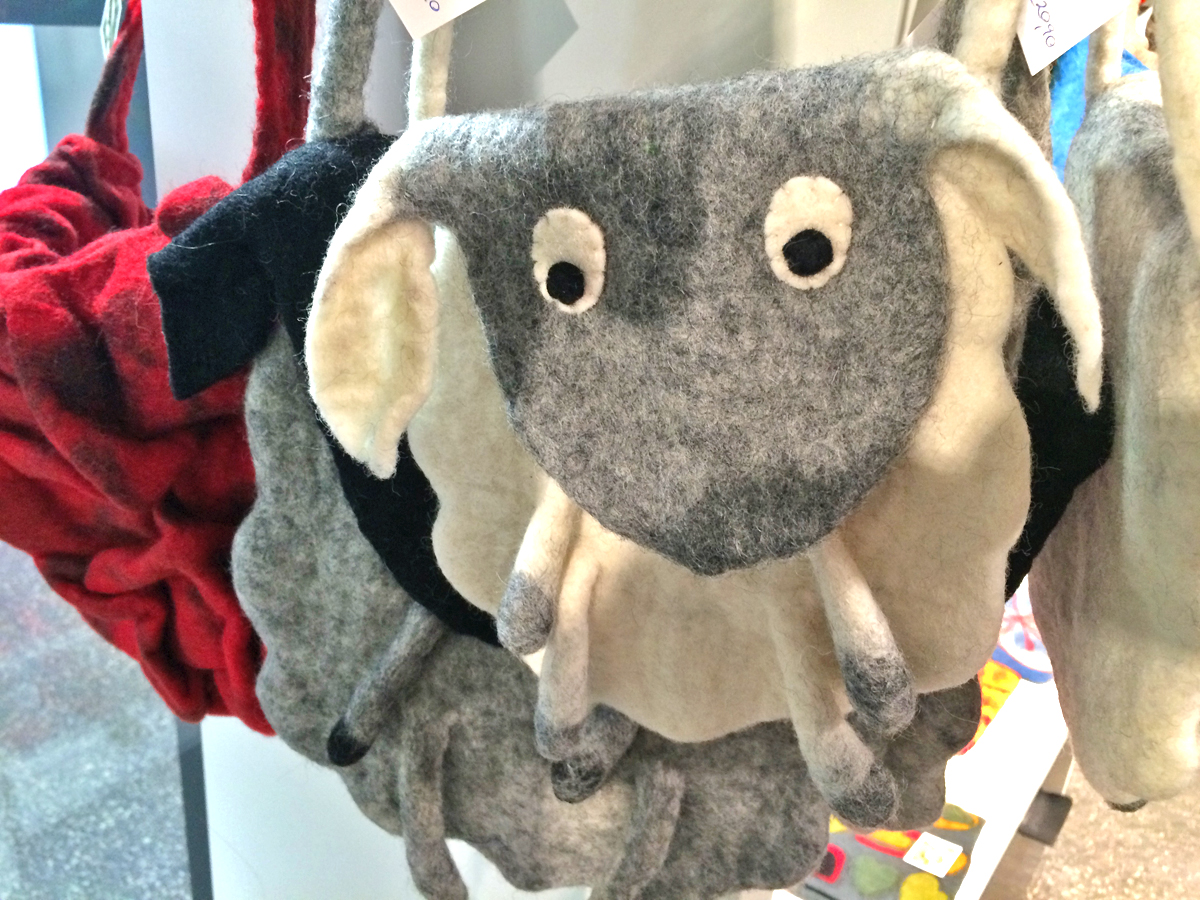 Die Filzerinnen haben scheinen phantasievoll zu sein, denn die Taschen sind in Form einer Erdbeere, von Kraken, Blumen oder Tieren gefertigt. Kuscheltiere gibt es ebenso wie Puppen oder modern anmutende Haushaltsgegenstände.