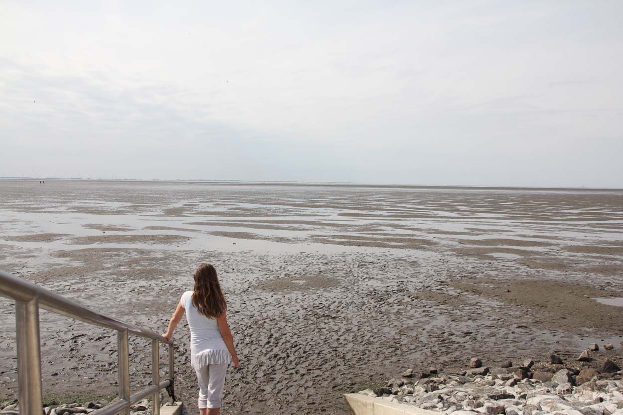 Ich wandere weiter zum Strand, der hier aus Deich und Watt besteht. Das Meer ist wie nach Tideplan erwartet nicht da und ich überlege, ob ich über diese Treppe und den schlickigen Boden an dieser Stelle in die Nordsee gleiten würde, wie es Stefanie vom Blog „In der Nähe bleiben“ getan hat. Eine Antwort gibt es an diesem Tag nicht, denn entweder sind die Zeiten ungünstig oder das Wetter (doofe Ausrede? Vielleicht.) Der Grünstrand und ich – wir beide brauchen noch mal einen Anlauf miteinander.