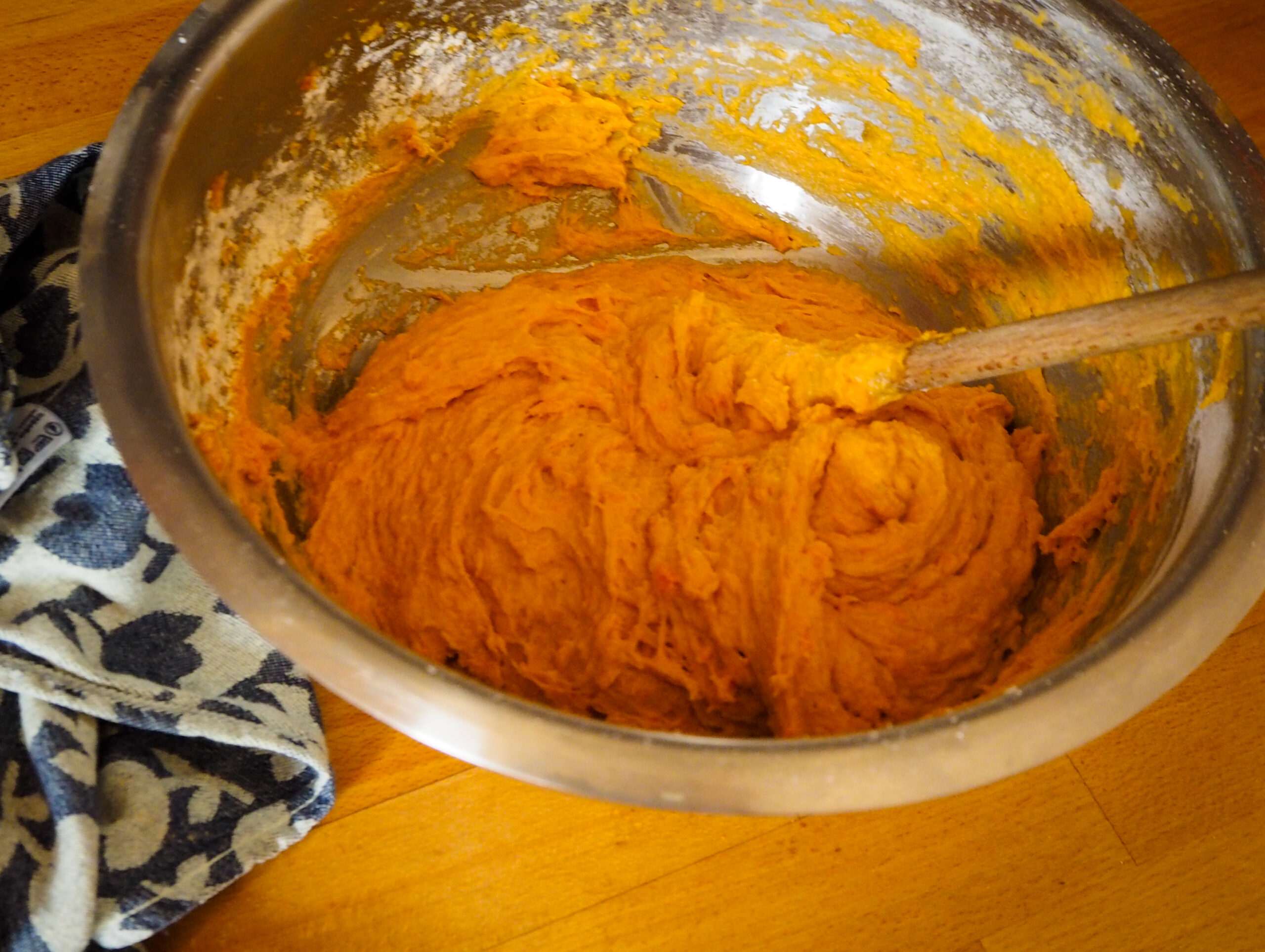 Die Süßkartoffeln schälen und in kleine Stücke schneiden. Weich kochen. Abkühlen lassen und dann zu einem Mus zerdrücken. Das Mus mit Salz, Muskatnuss, Stärke, Flohsamenschalen und Mehl verrühren, so dass eine Masse entsteht wie Kartoffelbrei.