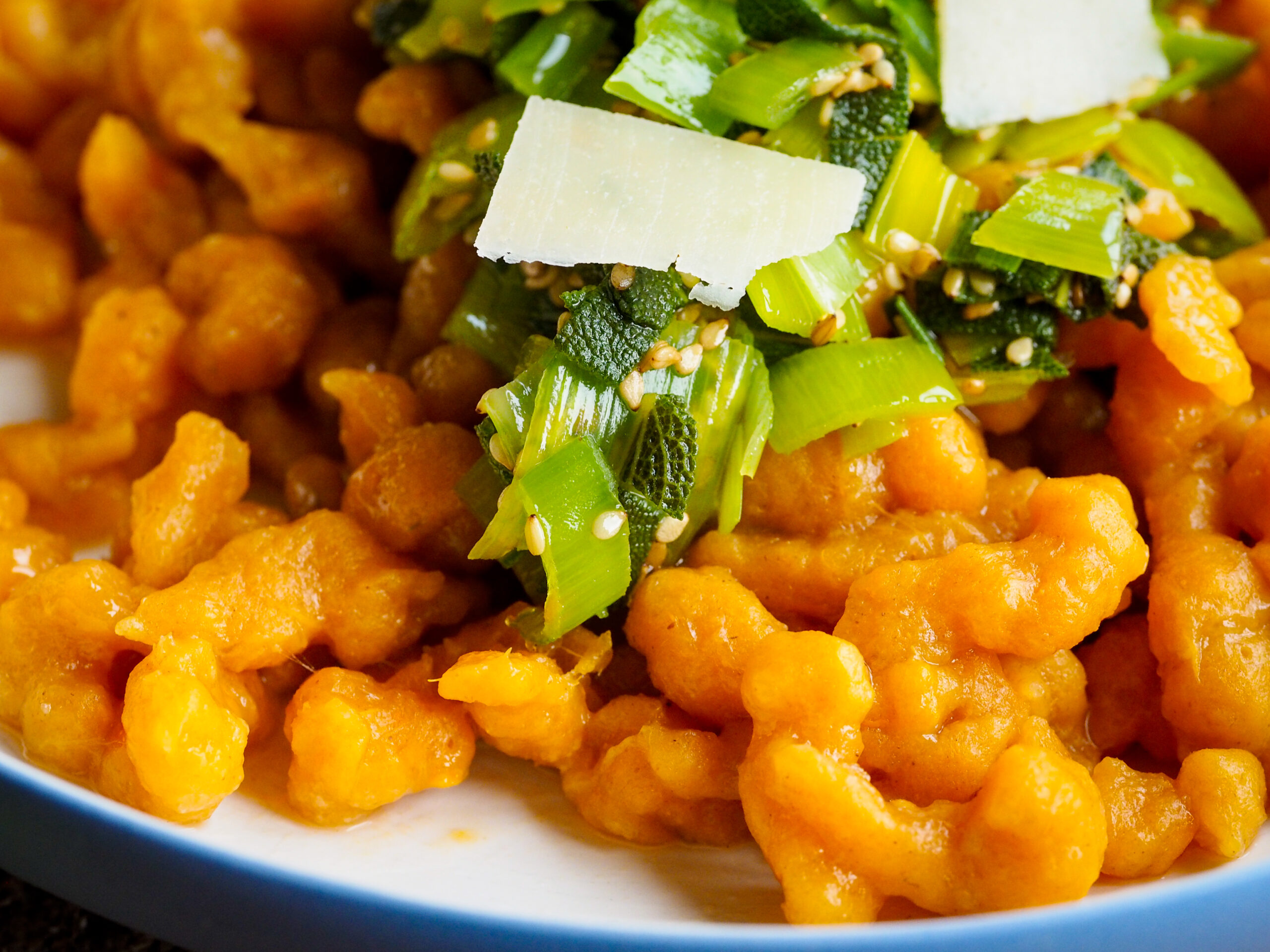 Manchmal probiert man etwas aus und weiß schon vorher, es wird nicht gelingen. So ging es mit mit meinen Süßkartoffelgnocchi. Ich habe es einfach nicht hinbekommen, dem Teig die richtige Konsistenz zu verpassen. Sowieso sind Gnocchi eine Herausforderung für mich, ich finde es schwierig, sie selbst zu machen. Und dabei esse ich sie doch so gerne. Doch bei mir werden sie immer zu klebrig. Vor allem Gnocchiteig aus Süßkartoffeln… der Teig war viel zu klebrig zum Ausrollen, also was tun? Ich habe einfach Spätze draus gemacht, dafür war die Masse perfekt. Und die Süßkartoffelspätzle sind superlecker geworden. Vor allem mit der pikanten Salbei-Lauch-Soße.
