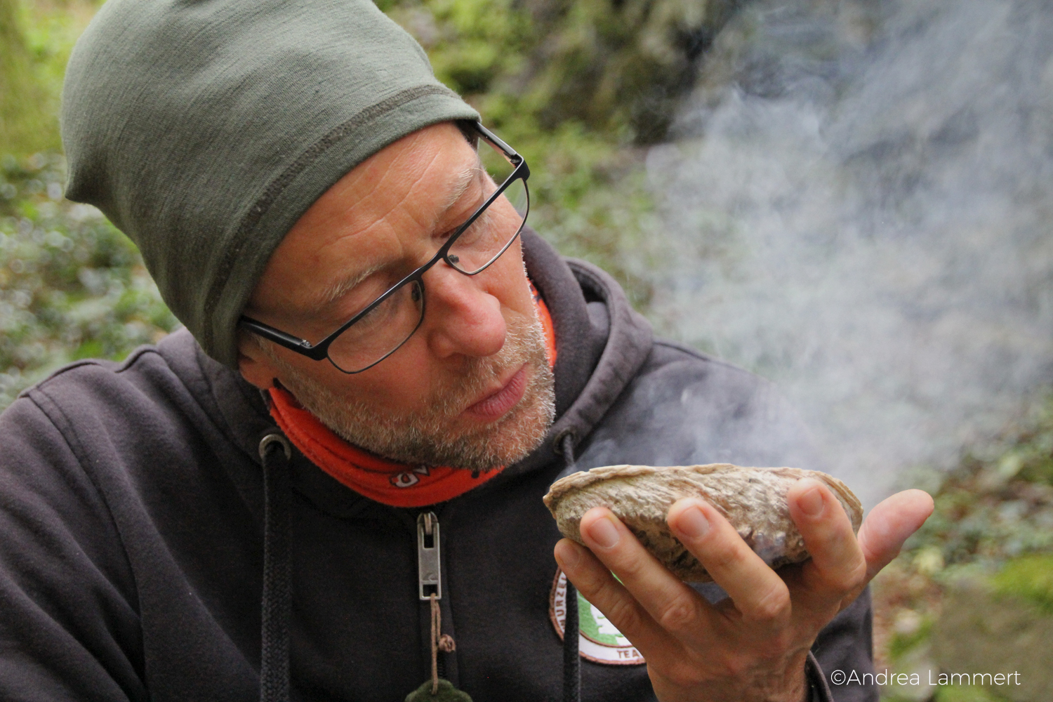 Es ist schon spät und dunkel, wir sitzen noch am Feuer. Eigentlich fallen mir schon die Augen zu, doch es heißt weiterarbeiten, denn wir haben noch kein Gefäß, um unser Wasser abzukochen. Abkochen ist immer besser als aus der Quelle zu trinken, man weiß schließlich nie, ob nicht doch ein totes Tier dort drin gelegen hat oder irgendwelche Keime sich im Wasser verstecken. Dazu sägen wir dicke Äste zu. Darein geben wir dann ein Stück unserer Kohle aus dem Feuer und warten, bis sie ein Loch in den Ast gefressen hat. Das schnitzen wir weg und geben ein neues Stück Kohle hinzu – bis wir eine Schale, Tasse oder einen kleinen Behälter haben. Ich allerdings verbrenne mir schon gleich am Anfang die Hände und gebe auf, wie mein Sohn auch, der ganz müde in den Schlafsack kriecht. Einige der Teilnehmer aber schaffen es ein Stück weit, ein Gefäß zu erschaffen. Doch das ist wie alles draußen, Geduldssache und zum Wasserkochen reicht sie noch lange nicht. Axel holt nun eine Blechtasse, holt Kieselsteine aus dem Feuer, gibt sie ins Wasser und wartet, bis sie es zum sieden bringen. „Auf diese Weise könnt Ihr Euer Wasser unterwegs kochen, es sollte aber 15 Minuten sprudeln und dafür braucht Ihr viele, heiße Steine.“ Kochen ohne Herd – wie praktisch, dann hab ich das auch gleich gelernt.