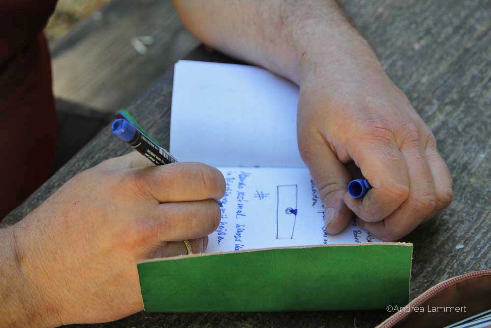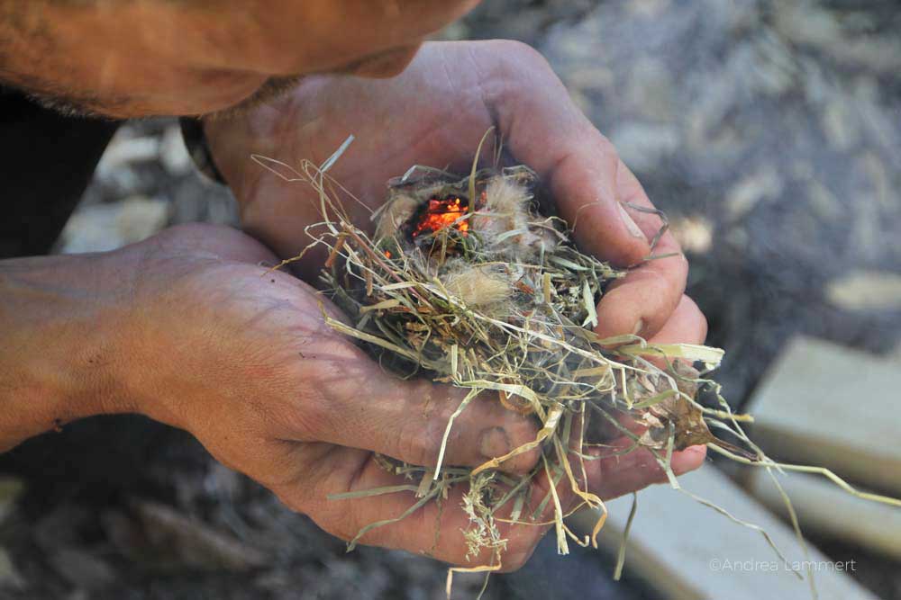 Axel Trapp zeigt uns, wie man einen Feuerbogen herstellt und genau damit sind wir die nächsten Stunden beschäftigt. Wir schnitzen und sägen dieses Werkzeug, das mit Reibung Glut erzeugt, die man dann gekonnt in ein Nest aus Heu, Distelsaat und vielleicht etwas Birkenrinde gibt, dann sanft hineinbläst und hoffentlich bald eine Flamme in der Hand hält. Mir will das nicht gelingen, zwei Männer allerdings schaffen es und lassen Flammen aus ihren Händen wachsen. Ein beeindruckendes Bild.