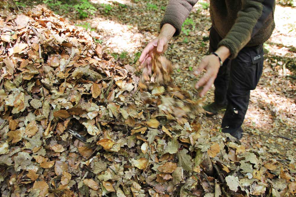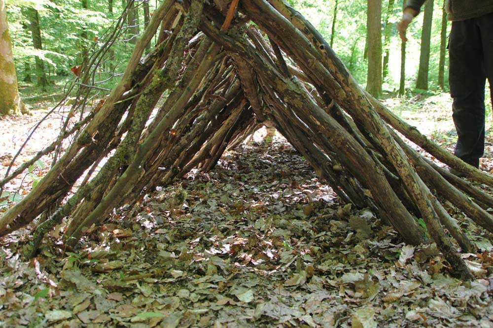 Wir ziehen in den Wald und Axel lässt uns selbst herausfinden, wo ein günstiger Platz für eine Hütte sei. Unter Bäumen? Auf einer Lichtung? Wir entscheiden uns für die Lichtung, schauen nach oben, ob keine toten Äste drohen, hinabzufallen und beginnen eine Hütte zu bauen, die letztendlich als Naturschlafsack für Wochen ausreichen würde. Wir schichten Stöcke zu einem Konstrukt und schütten Unmengen an Laub darüber. Mehr als zwei Stunden dauert der Bau dieses einfachen Unterschlupfes – und wir sind zu sechst. Das erstaunt mich, denn die Hütte sieht hinterher aus, als wäre sie in einer halben Stunde entstanden. „Allein braucht ihr für so ein Projekt einen Tag“, mahnt Axel. „Also fangt früh genug damit an.“ Als die Hütte fertig ist und mit einer mindestens armdicken Laubschicht im Inneren ausgefüllt, die als natürliche Isomatte wirkt, staune nicht nur ich, wie lange und aufwändig etwas ist, was in You-tube-Videos immer so schnell und einfach aussieht. „Das ist eben der Unterschied“, meint Axel, „man muss es wirklich einmal machen.“