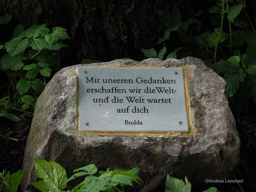 Während sie anderen Hunden nachschnupperte, fiel mir ein Stein mit einer Spruchtafel auf, der sich an der Hinterseite eines Grundstückes befand. Ein Mann harkte dort Blätter zusammen und ich dachte: „Ach schön, wenn Menschen Literarisches als Denkanstoß an den Weg stellen.“ Doch schon wenige Meter weiter bemerkte ich: Der philosophische Spruch war kein Zufall, sondern Teil eines Weges, der zum Nachdenken anregen soll.