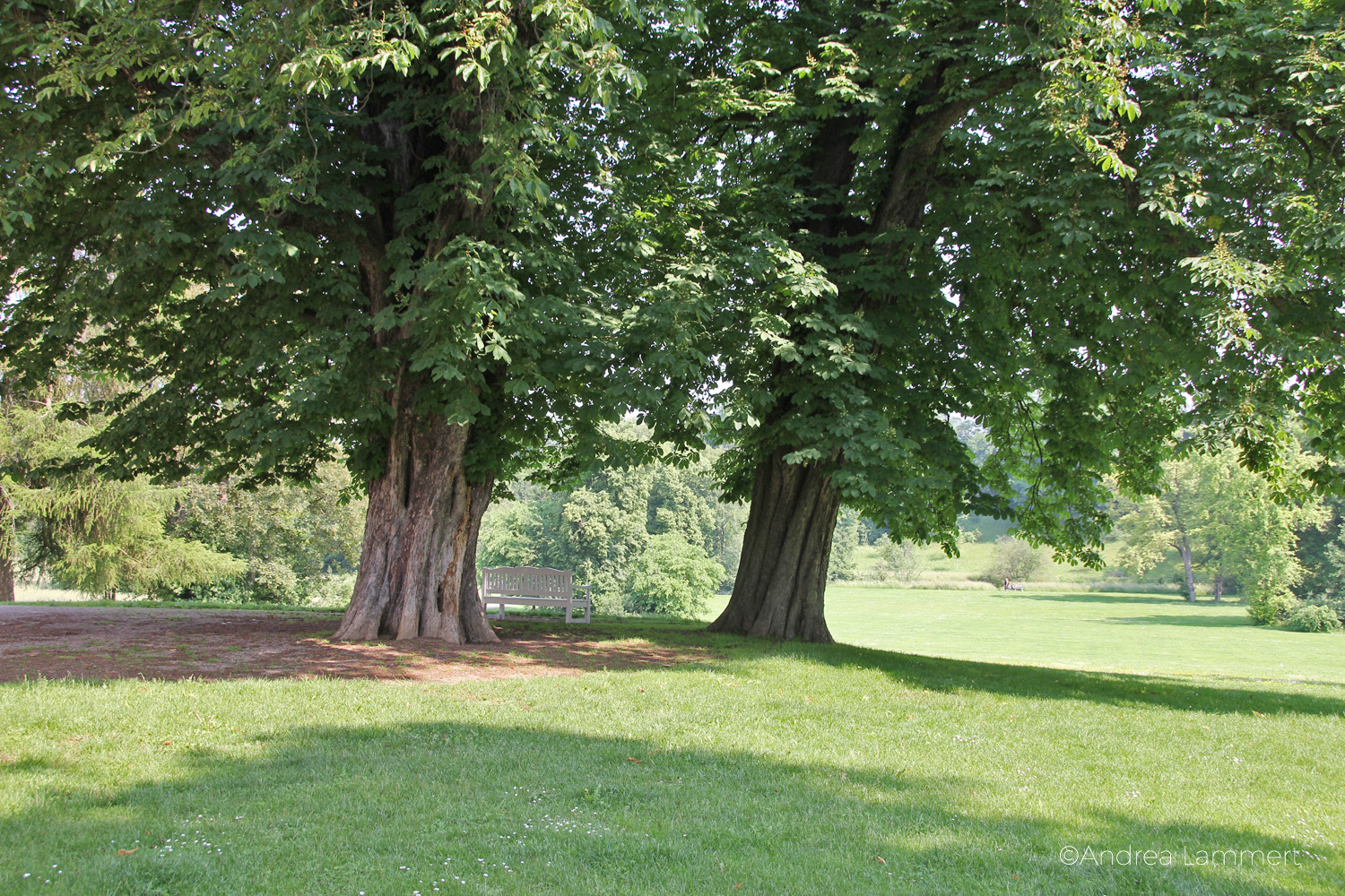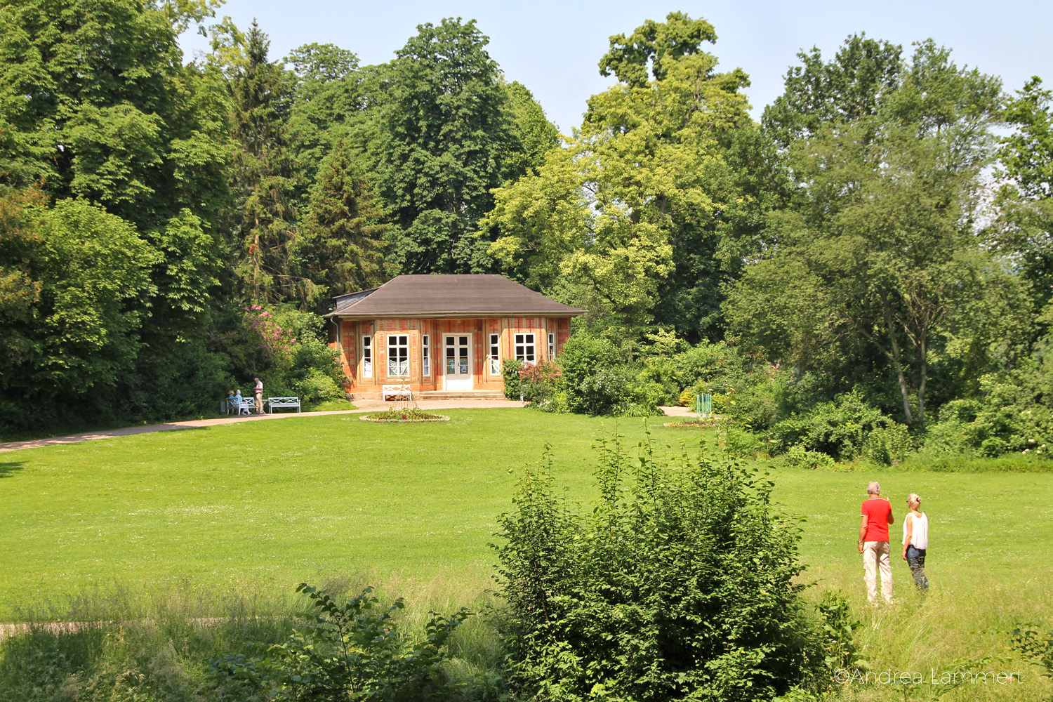 Dieses „Schloss“, das sich die Herzogin 1781 als Sommersitz wählte, stellt man sich immer viel größer vor, wenn man davon liest. Ich jedenfalls war irritiert, wie klein es war und suchte das Hauptgebäude in dem Park. Doch es war ja nur eine Sommerfrische. Was mich allerdings wirlich fasziniert hatte, war der Park um das Gebäude. Die Ilm fließt mitten durch den 21 Hektar großen Park, der sich als Steilhang auf der anderen Flusseite erhebt. Ich nehme euch einfach mal mit auf meinen Spaziergang durch dieses wunderbare Grün. Leider hatten wir den Picknickkorb vergessen, das ist wirklich ein perfekter Platz für ein Picknick in Weimar. Und von hier aus kann man auf dem Maria-Pawlowna-Pfad wieder in die Stadt wandern, ganz im Grün und Schatten.