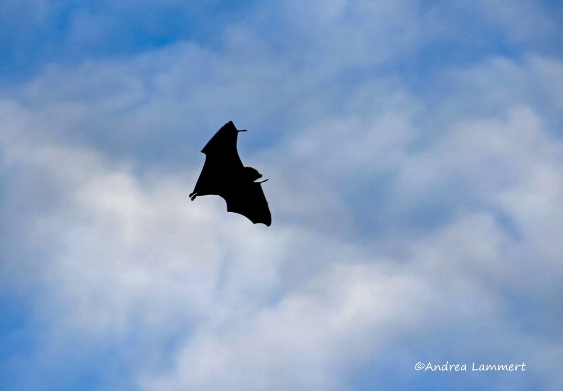 Wer auf Mauritius in den Himmel schaut, entdeckt an manchen Stellen ein wildes Geflatter. Pfeilschnell sausen die Flughunde durch die Luft, einige sind Frutarier, ernähren sich also nur von Obst. Was im Gegenlicht jetzt so schwarz geworden ist, ist ein Tier mit fuchsbraunem Körper und dunklen Flügeln, deren Häute so dünn sind, dass Licht hindurch scheint. Inzwischen sind diese Flughunde den Bauern aber lästig geworden, weil sie die Mangoernte reduzieren, deswegen dürfen sie jetzt auch getötet werden. Schade um die Vielfalt von Mauritius Tierwelt.