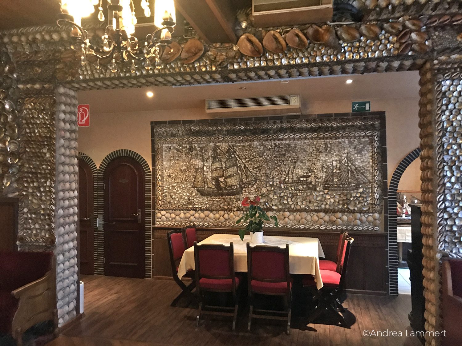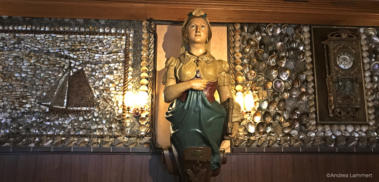 Marcus Jessen sollte Recht behalten, es war eine Zeitrreise, denn das Restaurant entstand vor 100 Jahren – und das Interieur ist bis heute so geblieben. Die Räume sind über und über mit Muscheln verziert, weil der erste Besitzer dieses Hauses, ein Malermeister, 1914 auf die Idee kam, das Haus mit Muscheln zu verzieren, die die Schiffe am Hamburger Hafen als Zuladung mitgebracht hatten, wenn die Fracht den Laderaum nicht ganz füllte. Und an dieser Einrichtung hat sich bis heute nichts geändert, samt der Gallionsfigur, die hier an den Wänden hängt.