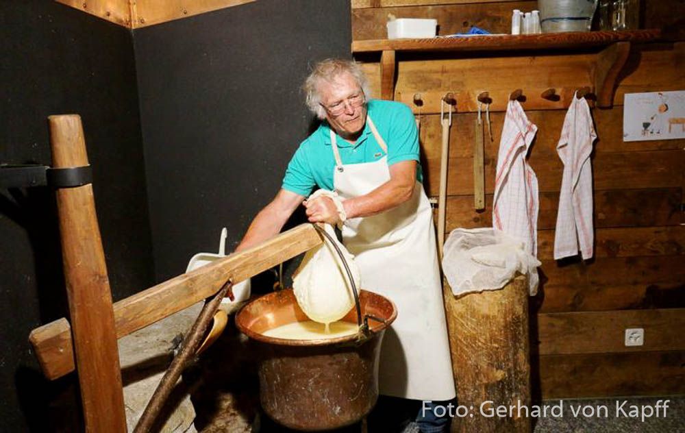Er schüttet Lab, ein Enzym aus dem Kälbermagen und Bakterien in den Kupferbottich mit der Milch, die er später umrührt, erwärmt und die geronnenen Anteile in einem Tuch zu einem Laib formt. Mehr an Rohstoffen braucht es nicht, um den Gottardo-Käse zu produzieren. 160 Euro kostet der Workshop für alle Teilnehmer, im Preis enthalten ist der Käselaib, der nach der Reifung zugesandt wird. Das ist allerdings aufgrund der Zollvorschriften nur innerhalb der Schweiz möglich, ausländische Gäste müssen ihn persönlich abholen.