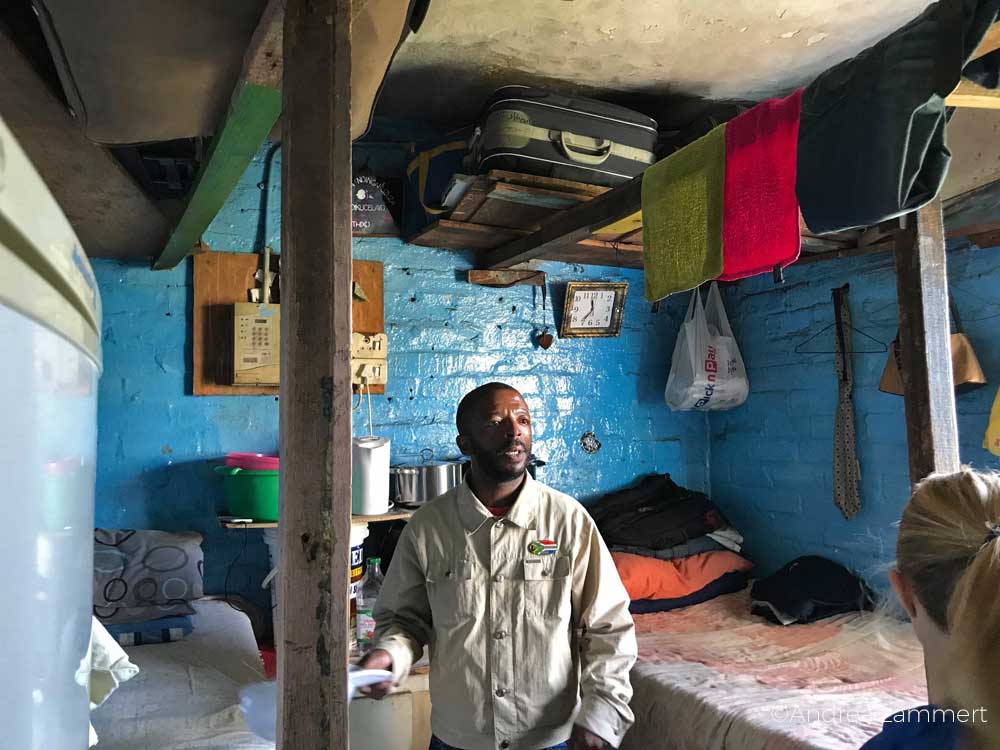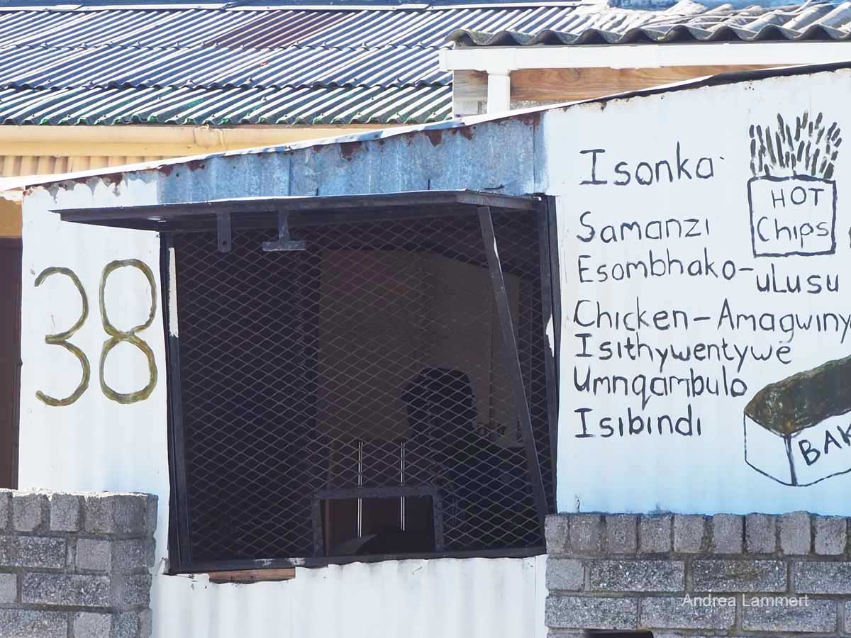 Hatten wir Blechhütten in diesem Township erwartet, wurden wir überrascht, es sind viele einfache Steinhäuser am Straßenrand. Manche der Menschen wohnen in ausgedienten Containern, andere in Häusern aus Stein. Einige verkaufen aus angebauten Wellblechhütten Fingerfood wie etwa Streifen vom gegrillten Schafskopf. „Das ist hier eines unserer liebsten Gerichte – Schafskopf“, führt der Mann vom Stamm der Xhosa weiter aus und bringt uns in eines der Gebäude.