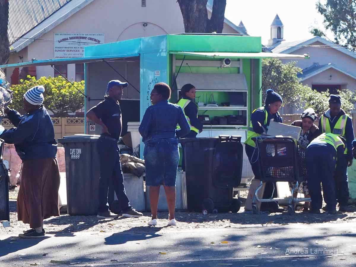 In Langa liegt erstaunlich wenig Plastik und zerbrochenes Glas an den Bordsteigen herum. Wir sehen auf der gegenüberliegenden Seite Frauen, die in Einkaufswagen Müll vor sich herschieben. Wertstoffe, die sie zu einer Sammelstelle bringen und einige Rand dafür bekommen. Meine Tochter beobachtet mit großen Augen, wie die Frauen mit bloßen Händen den Müll sortieren, dessen Gestank bis auf unsere Straßenseite dringt. Auch das ist Arbeit, mit der Menschen ihren Lebensunterhalt verdienen müssen, wenn sie nichts haben. Das Mülltrennen hier sieht Tandile positiv: „Wir haben seitdem wir für den Abfall bezahlen und solche Abgabestellen haben, unser Müllproblem besser im Griff.“