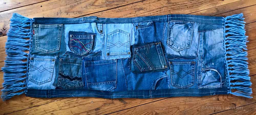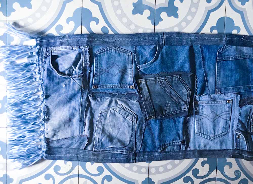 6. Schritt: Die Flicken sind festgenäht, jetzt fehlt ein schöner Saum, der dem ganzen Durcheinander optisch Ruhe und Stabilität bringt. Ich habe dafür aus den Hosenbeinen der Jeans ein Bändchen gefertigt, indem ich mehrene Stoffstücke aneinander genäht habe. Anschließend habe ich sie abgesteckt, wie ich den Saum nähen wollte und gebügelt. Jetzt hatte ich einen Kniff um Stoff, der mir das Stecken und Nähen leichter macht. Dass es dennoch etwas krumm geworden ist, liegt daran, dass meine Nähmaschine bei so dicken Lagen Stoff irgendwann trotzdem streikt, trotz Jeansnadel.