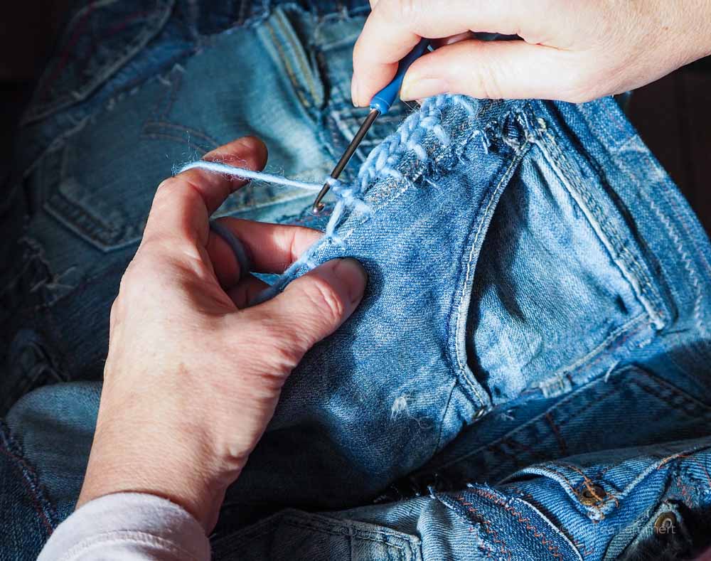 9. Schritt: Mit der Häkelnadel macht ihr eine Anfangsschlaufe, hakt sie in die erste Schlingedes Festonstiches ein und häkelt im Luftmaschenstil einen zweiten Saum. Alle drei Maschen verbindet Ihr die Luftmaschenschlange mit dem Jeansteppich an der Schlaufe vom Festonstich.