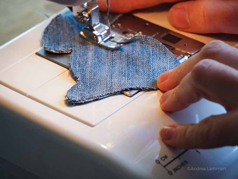 Schritt 4: Du brauchst je 2 Hasen, die du mit der linken Stoffseite aufeinander legst. Diese steckst du aneinander fest und nähst am Rand der Figur entlang. Gib etwas Nahtzugabe, damit die Jeans nicht gleich ausfransen und du dir die Arbeit umsonst gemacht hast. Wenn du am Schwanzpuschel angekommen bist, nimmt dir die Füllwatte, lege sie über den angedeuteten Schwanz und nähe sie mit einer kleinen Naht fest.