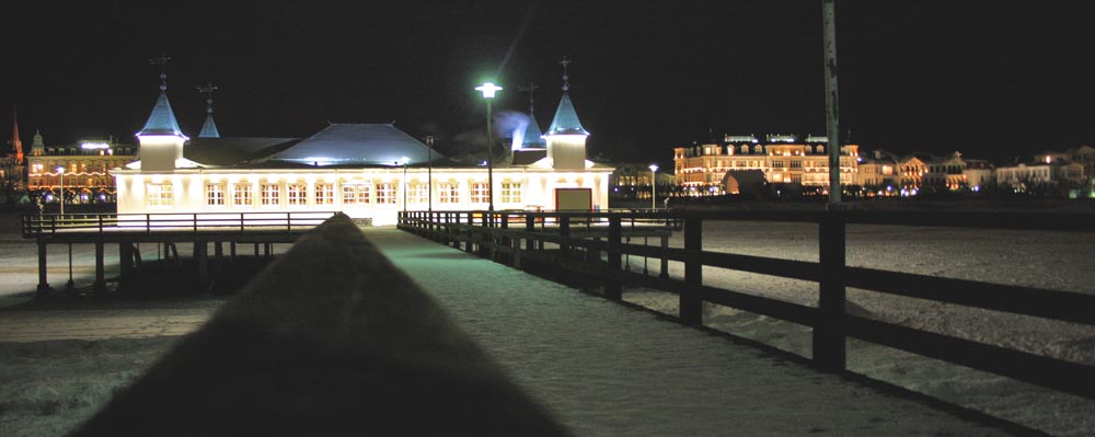 Wie ein Magnet zieht sie mich an. Es ist schon dunkel, neben mir rauschen die Wellen an den Ostseestrand und der weiße Strand leuchtet nur ein ganz bisschen in der schwarzen Nacht. Ich bin allein auf Usedom im Winter, gerade erst angekommen – und jetzt hält mich nichts mehr. In der Ferne ragt ein Streifen aus Lichtern weit ins Meer hinein. Die Seebrücke von Ahlbeck! Seitdem ich die ersten Bilder von diesem kleinen Holzschloss an einem langen Steg gesehen habe, wusste ich: Hier werde ich eines Tages stehen.