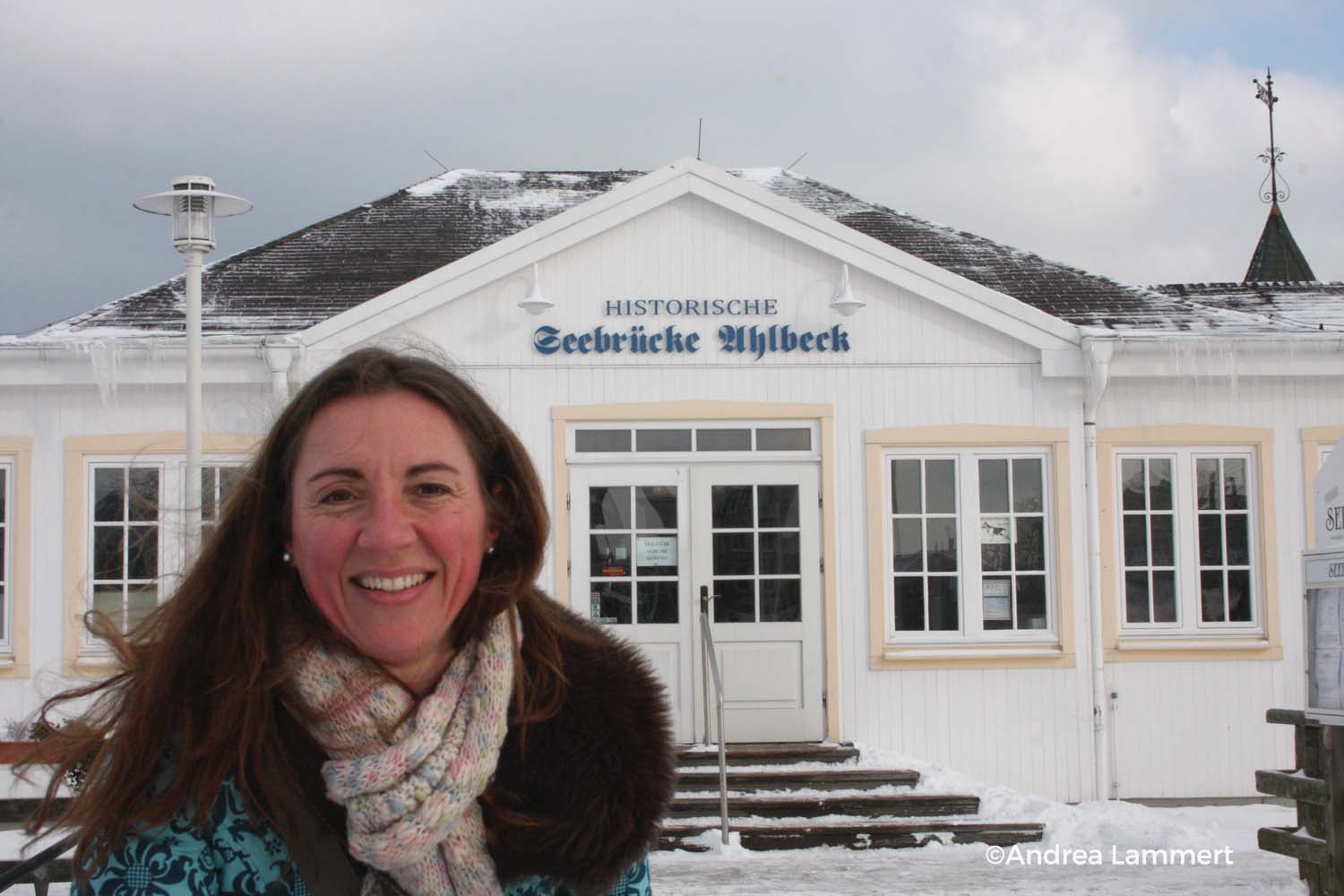 Die Seebrücke in Ahlbeck ist bei jedem Wetter schön. Sogar jetzt im Schnee. Seit ich den Loriot-Film „Papa ante Portas“ gesehen habe, wollte ich an diesen Platz. Zu eindrucksvoll war die Schlussszene mit dem gemeinsamen Essen über den schäumenden Ostseewellen. Im letzten Jahr war ich auf Usedom im Winter.