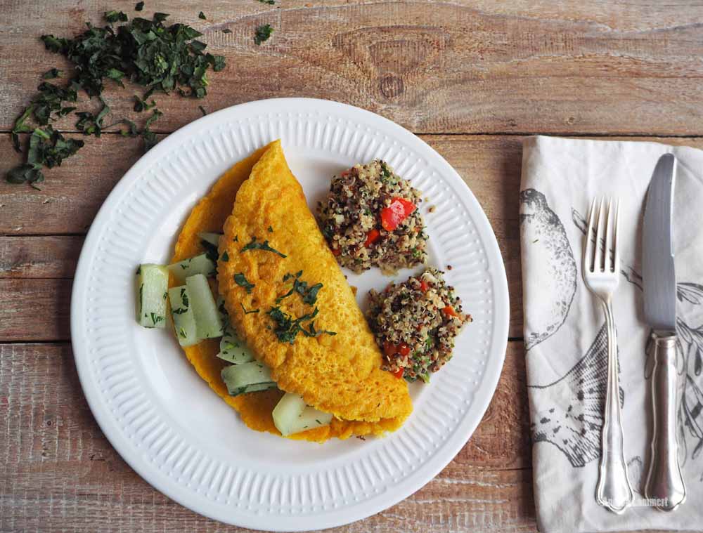 Für Omelett muss man nicht immer Eier im Kühlschrank haben. Ein Glas Kichererbsen geht auch – daraus lässt sich herrliches, veganes Omelett zaubern.