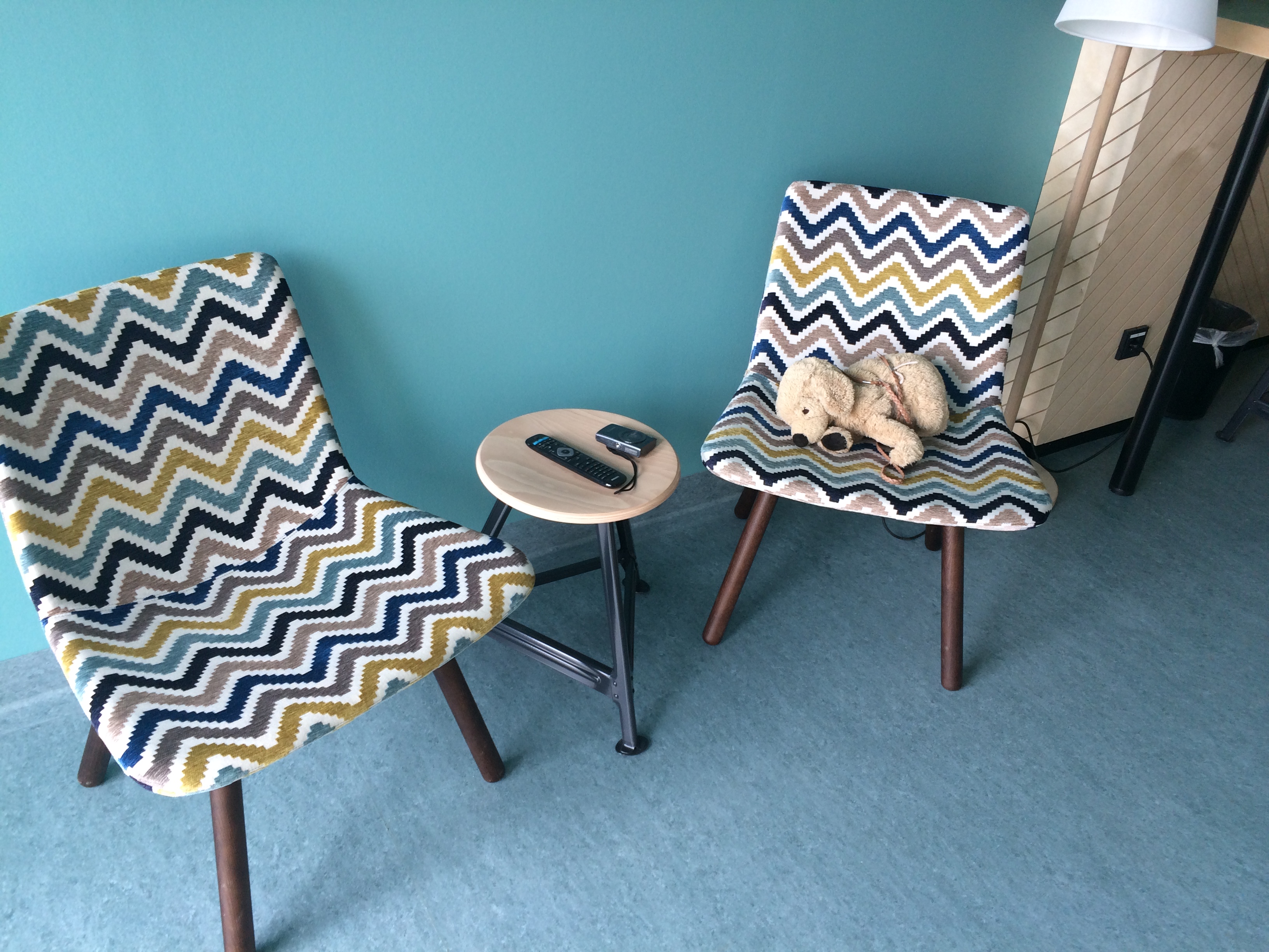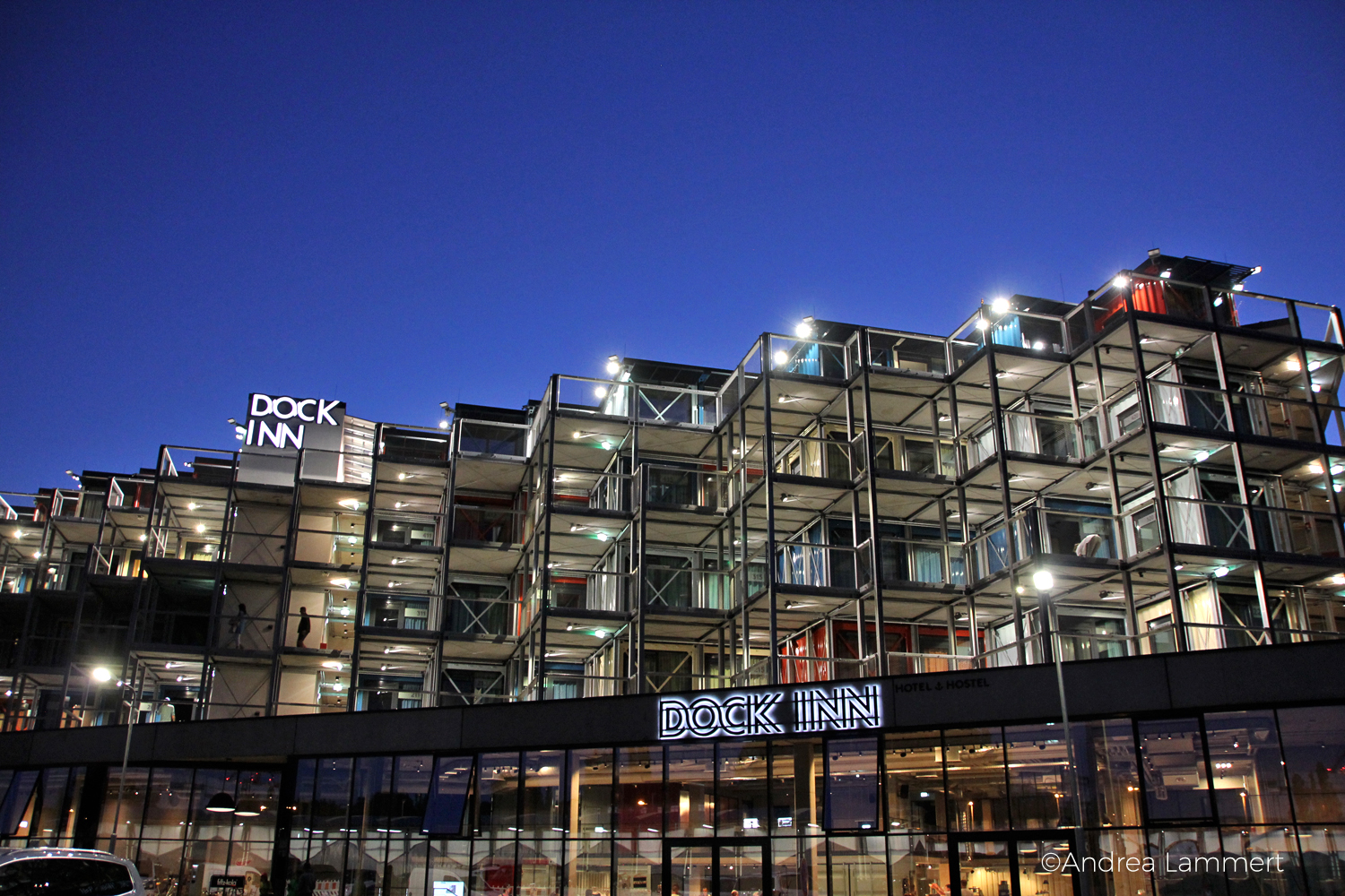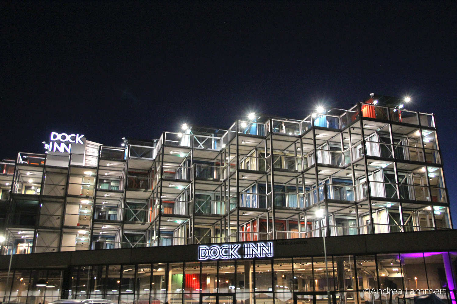Tatsächlich sieht das Dock Inn aus wie ein Haufen ordentlich gestapelter Container, es wirkt von außen sehr geometrisch und modern. Türkisfarbene Fahrräder stehen vor der Tür, anstatt eines Gepäckkorbes haben sie eine leere Getränkekiste auf den Gepäckträger geschnallt. Drinnen empfängt uns ein großer, heller Raum, in dem direkt vor der Rezeption Kinder zwei Fußballtore auf den geschliffenen Betonfußboden gestellt haben und fröhlich eine Runde kicken, während ihre Eltern noch in Ruhe zu ende frühstücken.