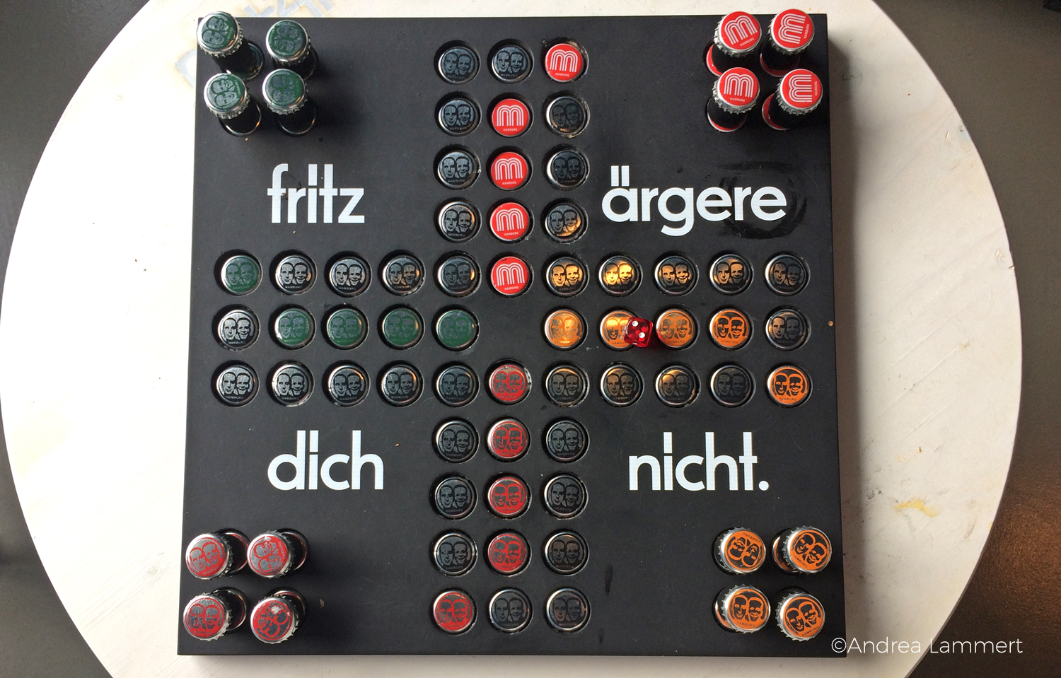 Der große Raum unten wird von Containern aufgeteilt, die kleine Lounges bilden, in die man sich zum Mensch-Ärger-Dich-Nicht-Spielen (mit Kronkroken, Upcycling wird hier offenbar groß geschrieben) oder chillen zurückziehen kann. In einem Container oben ist ein kleines Kino untergebracht, daneben stehen zur Freude der Kinder Flipperautomaten.