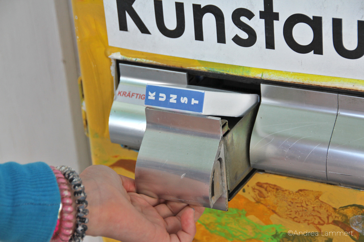 Ich mag ja Upcycling, also die Idee, aus alten Sachen neue und schöne zu fertigen. Und deswegen gehört dieser ausgediente Zigarettenautomat zu meinen Favoriten in Warnemünde. Er wurde mit Kunstwerken lokaler Maler, Töpfer und Bildhauer befüllt und gibt nun zu einem Preis, der günstiger ist, als eine Zigarettenschachtel, ein kleines Kunstwerk. Einfach drei Euro einwerfen und an der Lade ziehen. Wir hatten ein getöpfertes Schild in dem kleinen Kunstkarton. Ich weiß zwar nicht, was ich damit machen soll, aber eine schöne Idee ist es trotzdem.