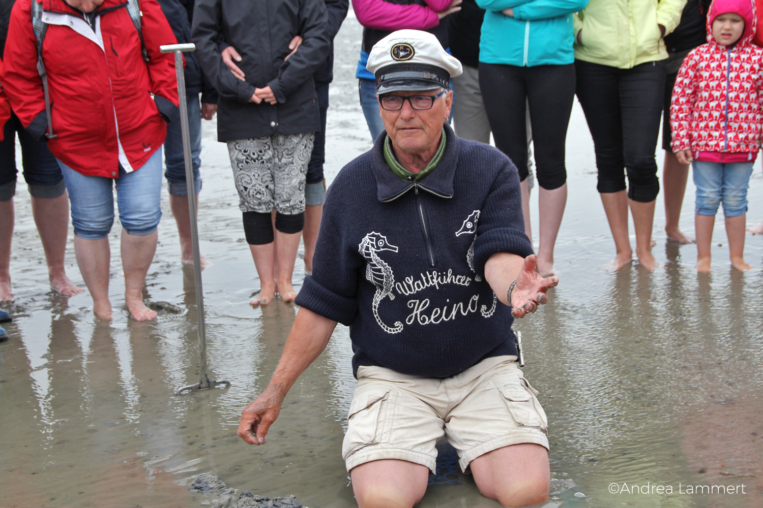 Die Zahl der Wattwürmer habe sich insgesamt in den vergangenen Jahrzehnten nahezu halbiert. „Der Bau von Häfen, die Vertiefung der Fahrrinnen, etwa für die Fähre nach Juist, Verklappung von Müll im Meer, all das ist nicht gut für den Lebensraum des Wurms.“ Heino schaut in die Runde, seine tiefblauen Augen eindringlich auf seine rund 50 Teilnehmer der Wattwanderung gerichtet: „Und jetzt fragt Ihr Euch: Was habe ich damit zu tun? Ich sitze in Stuttgart oder NRW und bin weit weg von Watt?“ Heino schüttelt den Kopf. „Nee, nee. Ihr hängt alle mit am Tropf des Wattenmeeres.“