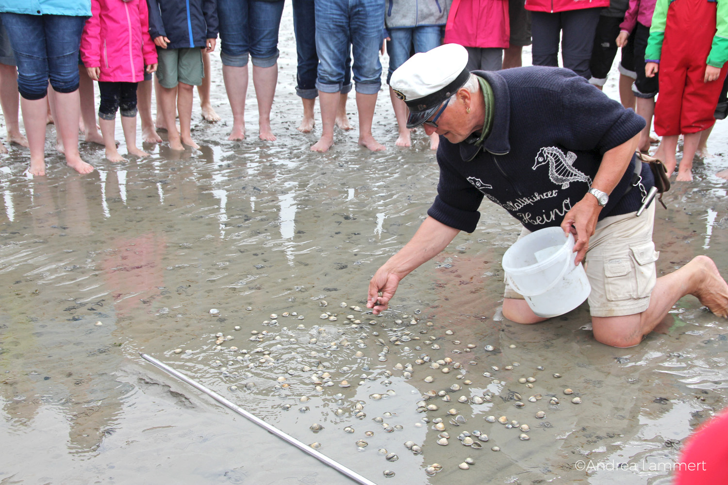 Weiter geht es zu den Krebsen. „Sandkrabben heißen die“, korrigiert Heino, der schon seit 37 Jahren Wattführungen macht und diesen Beruf von seinem Vater gelernt hat. Dabei erzählt er so manche Anekdote. Er hat heute morgen einen Eimer voll gefangen, weil er sie den Teilnehmern der Führung zeigen wollte. Jeder bekommt eines dieser bescherten Schalentierchen in die Hand, auch ich. Ich muss zugeben, auch nachdem neben mir einer „autsch“ gerufen hat, ist mein Respekt vor den Krebsen etwas gestiegen. Als ich sie aber mit sicherem Griff festhalte, denke ich, dass der Krebs bestimmt mehr Angst hat als ich und fühle mich irgendwie unwohl, ihn in der Hand zu halten, anstatt das Tier im Watt zu wissen. Also noch einmal anschauen und dann schnell ins Wasser geben, wo er sich hurtig wieder eingräbt.