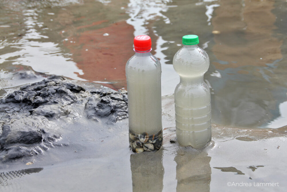 Heino füllt zwei Flaschen mit trübem Meereswasser. In eine gibt er Muscheln, in die andere nicht. Am Ende der Wanderung ist das Muschelwasser klar wie Leitungswasser – ein beeindruckender Effekt, der für viele Teilnehmer unvergesslich bleibt. Die Muscheln haben alle Schwebstoffe geklärt.