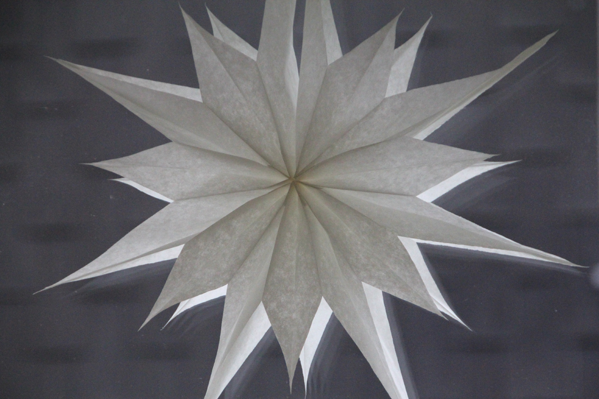 Wenn man die letzten Enden nicht zusammenklebt, sondern Löcher hineinschneidet und ein Band durchfädelt, kann man den Stern nach Weihnachten zusammenklappen und sicher in der Kiste verstauen – bis zum nächsten Jahr.
