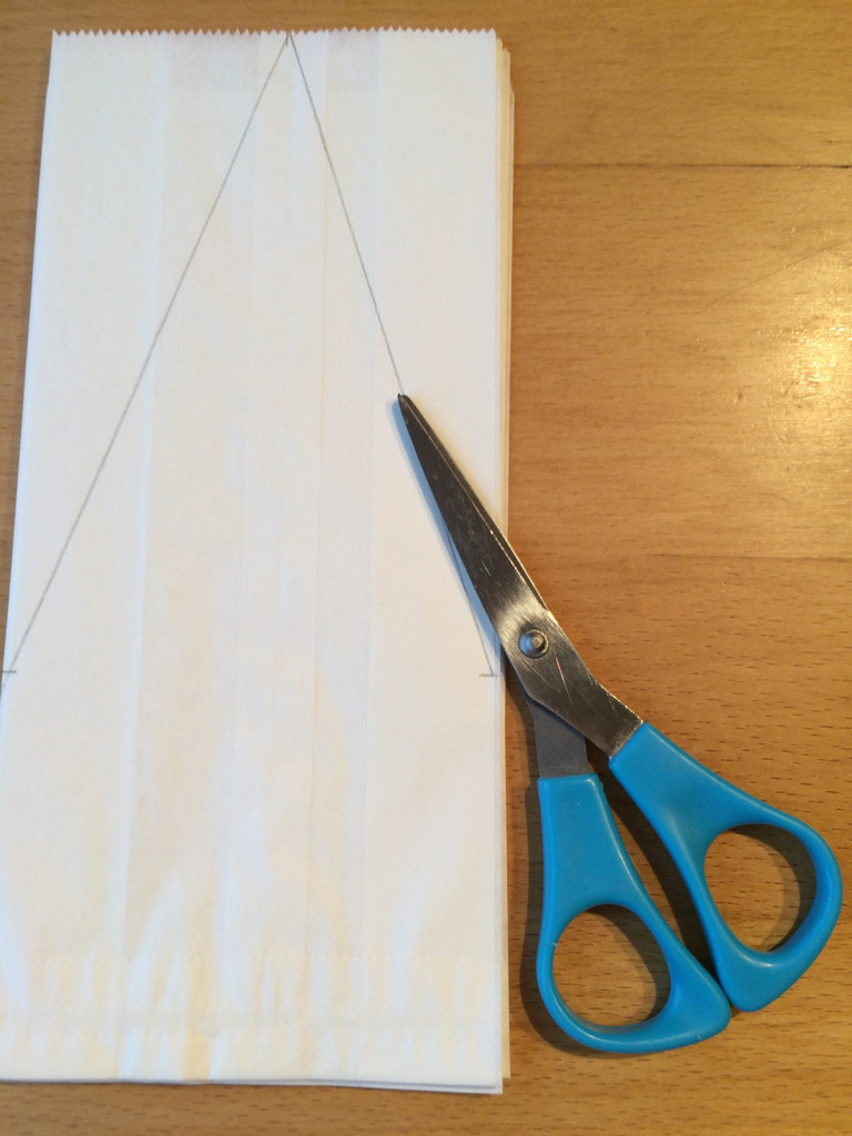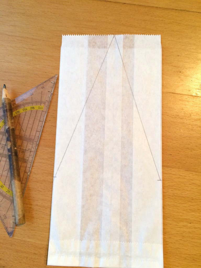 Jetzt braucht Ihr das Lineal. Rechts und links im unteren Fünftel markiert Ihr zwei Punkte, ebenfalls oben am Tütenrand mittig einen. Die Punkte verbindet Ihr, so wie in diesem Foto und schneidet die Dreiecke aus. Jetzt faltet Ihr die verbliebenen Dreiecke auseinander – fertig ist Euer Stern. Ich finde ihn zauberhaft mit seiner dreidimensionalen Wirkung. Dreidimensional, groß und doch sehr fragil wirkt er, wenn er so vor dem Fenster hängt. Übrigens ist er in diesem Jahr bei uns so beliebt, dass Brottüten in den Geschäften ausverkauft sind.