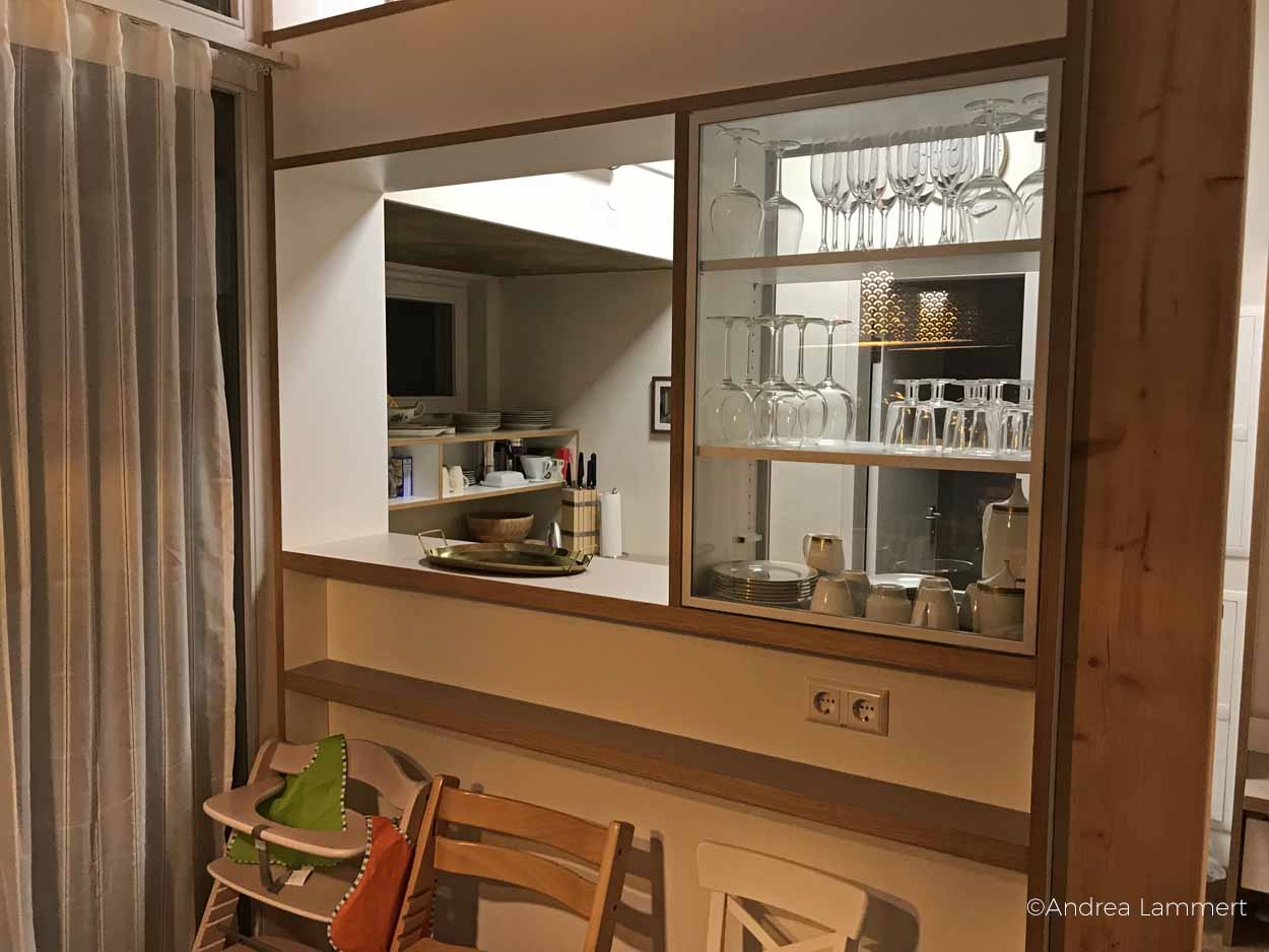 Das Dachgeschoss mit den Ferienwohnungen wirkt wie ein eigenes, kleines Haus im Haus. Unter der Schräge ist es kuschelig wie in einem Zelt, nur dass die Räume viel größer und komfortabler sind. Das Bett ist derart breit, dass wir locker als ganze Familie in einem Bett schlafen könnten – himmlisch viel Platz und morgens mit Aussicht auf den Sonnenaufgang. In der Küche gibt es stilecht Geschirr aus den 1920er Jahren und wenn nicht gerade der Ostwind wie bei uns eine Kältefront bringt, kann man sogar im Laubengang vor der Wohnung im Freien sitzen und eine Auszeit vom Kulturtrubel genießen. Goethehaus und Deutsches Nationaltheater sind um die Ecke – und dieses Gefühl, in einer alten Bank zu schlafen, über den Tresor- und Verhandlungsräumen ist schon etwas ganz Besonderes.
