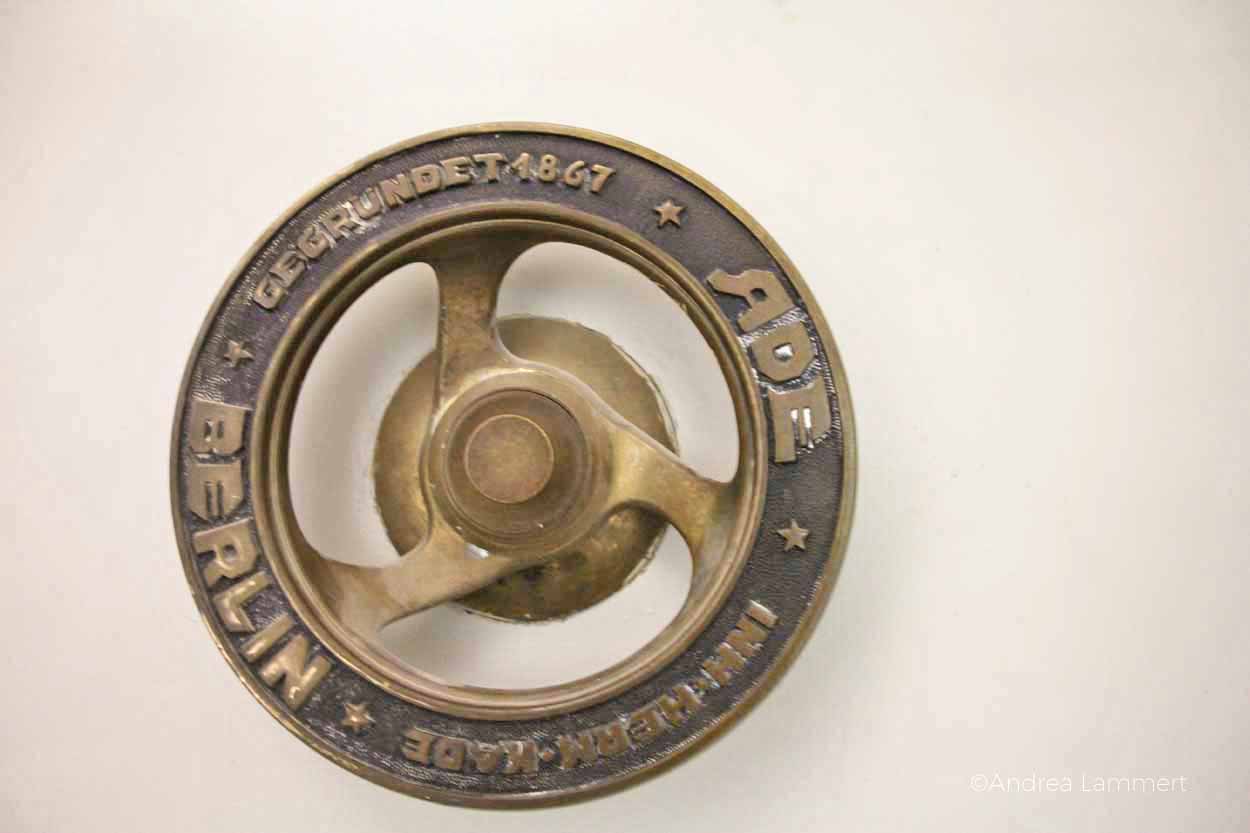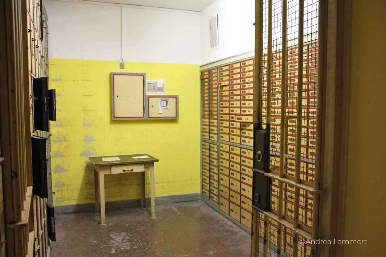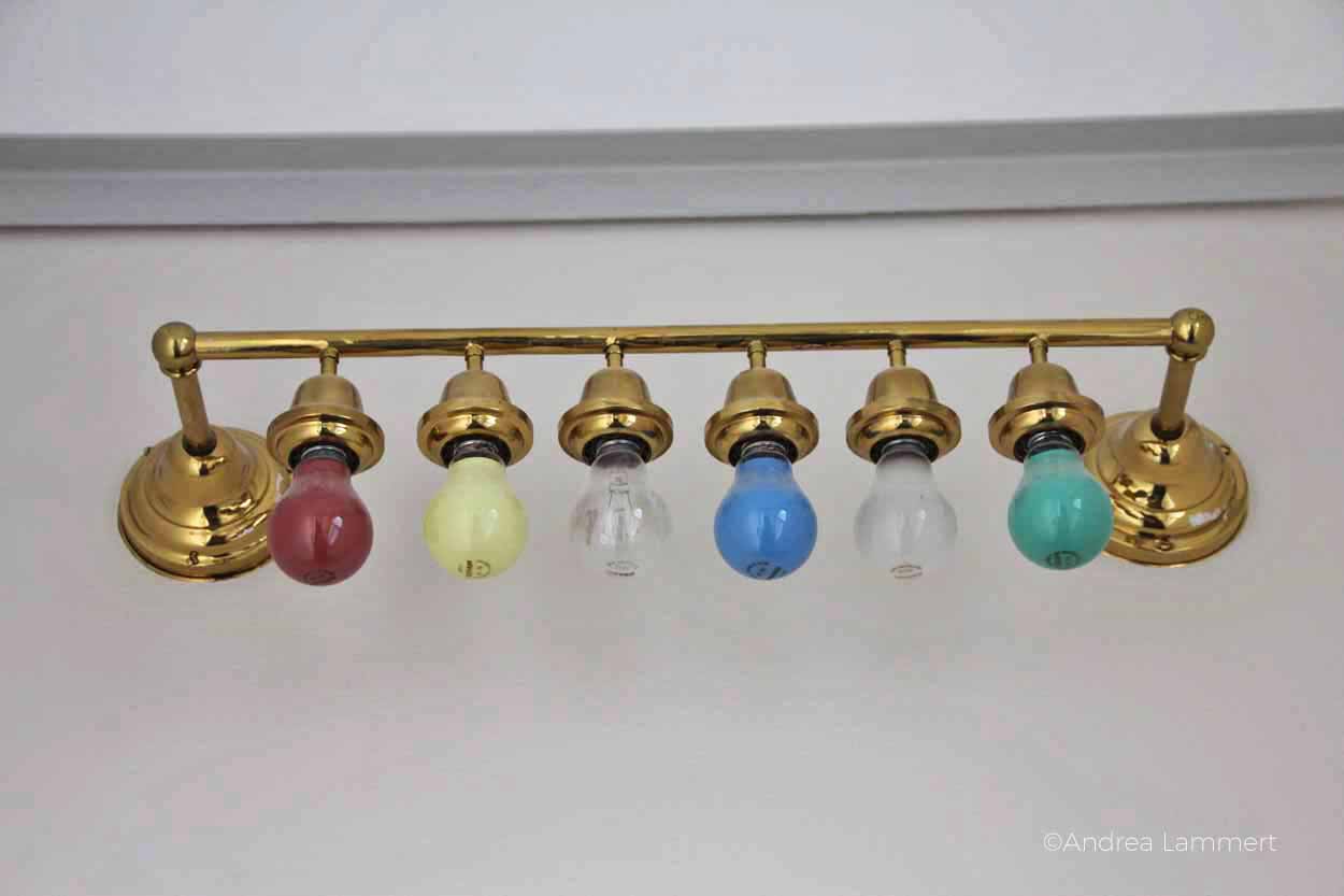 Als erstes erklärt er uns den Sinn der sechs bunten Glühbirnen, die auf den Gängen in kunstvollen Aufhängungen von der Decke hängen. „Das ist ein Nachrichtensystem.“ Ah, eine Art modernes Whats App, mutmaßt mein Sohn. Genau, gepaart mit einer Geheimsprache, beeindruckt ihn das nachhaltig. „Einige wichtige Mitarbeiter hatten eine spezielle Kombination dieser Lampen. Wenn sie nicht am Platz erreichbar waren, weil sie mit Herrn Müller auf dem Flur Kaffee getrunken haben, dann sahen sie, dass die Lampen leuchteten und wichtige Anliegen zu klären waren.“ Ein spannendes System.