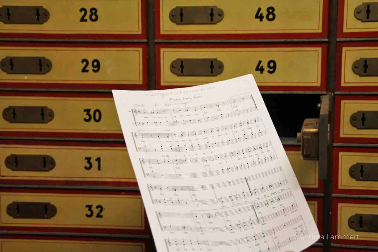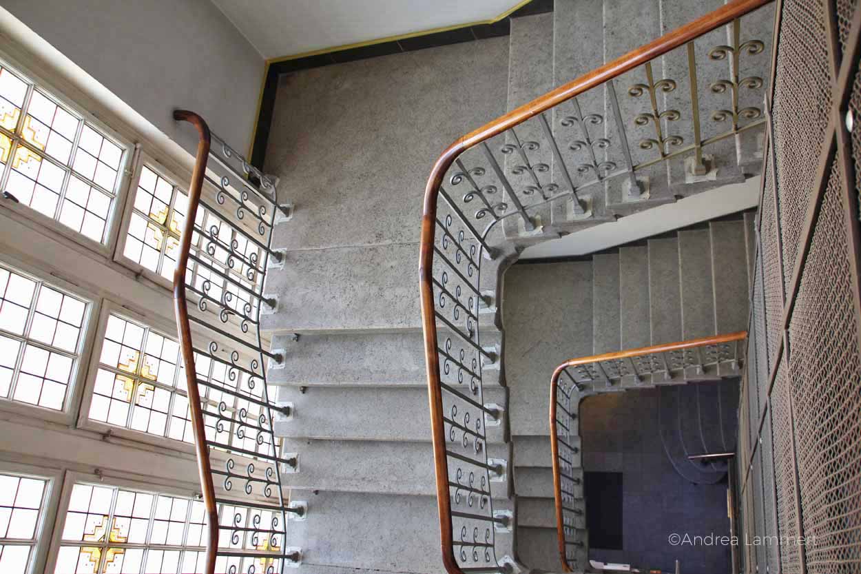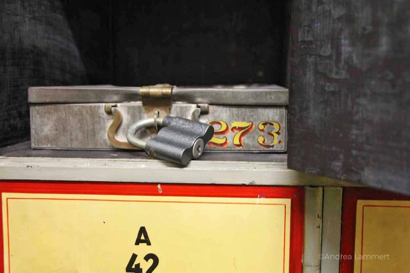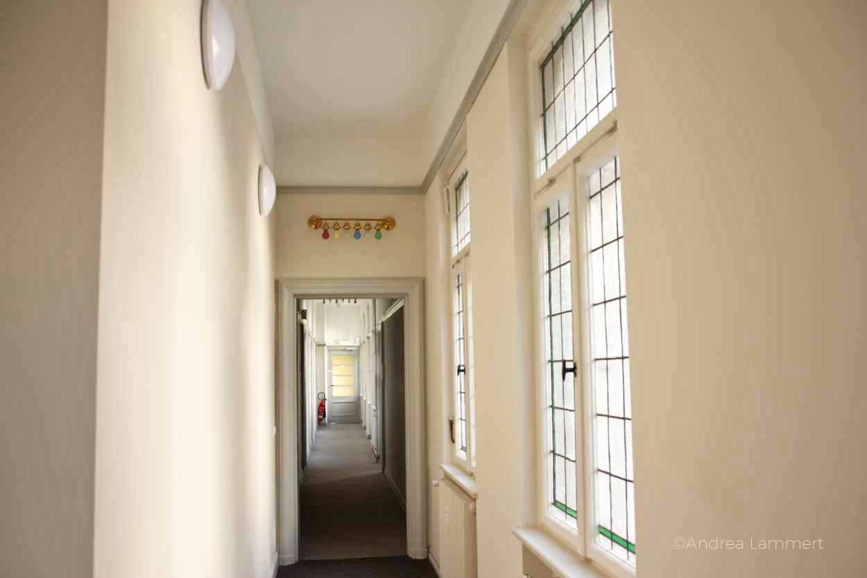 Als erstes erklärt er uns den Sinn der sechs bunten Glühbirnen, die auf den Gängen in kunstvollen Aufhängungen von der Decke hängen. „Das ist ein Nachrichtensystem.“ Ah, eine Art modernes Whats App, mutmaßt mein Sohn. Genau, gepaart mit einer Geheimsprache, beeindruckt ihn das nachhaltig. „Einige wichtige Mitarbeiter hatten eine spezielle Kombination dieser Lampen. Wenn sie nicht am Platz erreichbar waren, weil sie mit Herrn Müller auf dem Flur Kaffee getrunken haben, dann sahen sie, dass die Lampen leuchteten und wichtige Anliegen zu klären waren.“ Ein spannendes System.