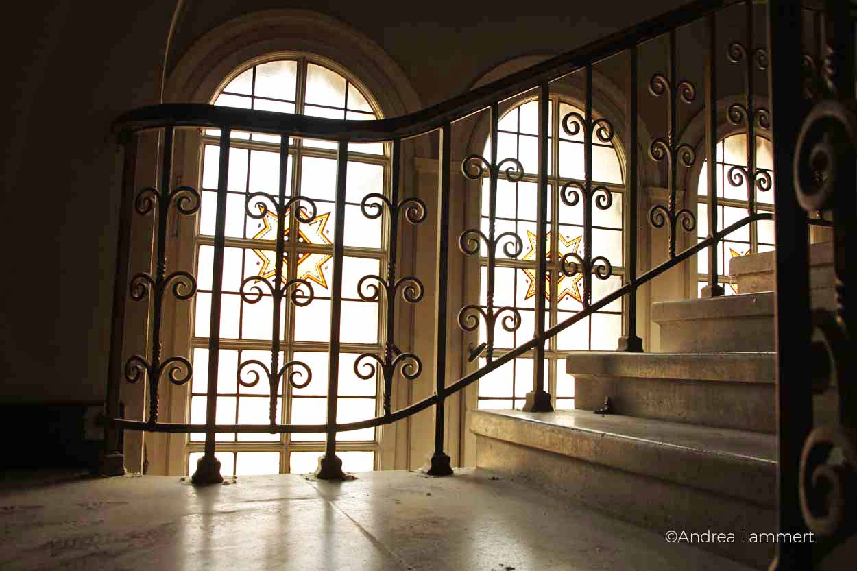 Doch viel interessanter wird es tatsächlich im Keller, der ebenfalls mit seinen vergitterten Toren und den dicken Tresortüren komplett unter Denkmalschutz steht. Es gibt nicht nur einen Raum, in dem sich damals tatsächlich das Geld der Landesbank Thüringen stapelte, sondern auch einen Raum mit vielen kleinen Tresoren. „In einem Tresor haben wir sogar eine mumifizierte Ratte gefunden“, erzählt Anselm Graubner. Wie die dorthin gekommen ist, weiß niemand so genau. Heute sehen die Räume eher aus wie ein Museum – gepflegt, manche ein wenig plötzlich verlassen und alle unbelebt, so als wäre die Notenbank gerade erst ausgezogen. Durch lange Gänge geht es wieder zurück ins Erdgeschoss, dort befinden sich Konzerträume und eine Etage höher ist das ehemalige Direktorenzimmer, alles eben wie ein kleines, privates Museum, nur dass es mit Leben gefüllt ist, weil sich viele Bürogemeinschaften dort niedergelassen haben.