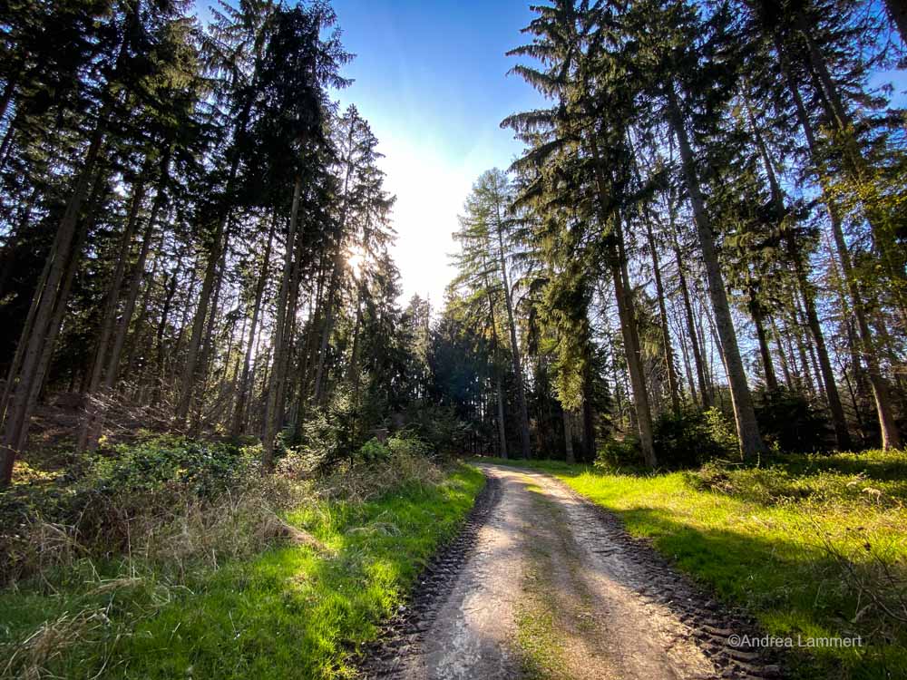 Ich war mitten im Fichtenwald, als mir einfiel, dass ich noch einen Termin hatte. Ich fragte kurz Google, wie lang ich denn noch zum Taternpfahl gehen müsste und stellte fest, dass das nicht zu schaffen war. Es wäre sowieso schwierig gewesen, denn die Strecke von Steinkrug aus misst mehr als 5 km in eine Richtung, für meinen Seniorenhund wäre das ein bisschen zu anstrengend gewesen. Also kehrte ich um und am nächsten Tag mit einer Freundin zurück zum Wanderweg zum Taternpfahl. Fest entschlossen, dass es dieses Mal klappen müsste. Der Seniorenhund war nun kuschelig mit den Kindern zu Hause, wurde von den Mädels betüddelt, ich hatte den Jungspundhund an der Leine und es konnte losgehen.