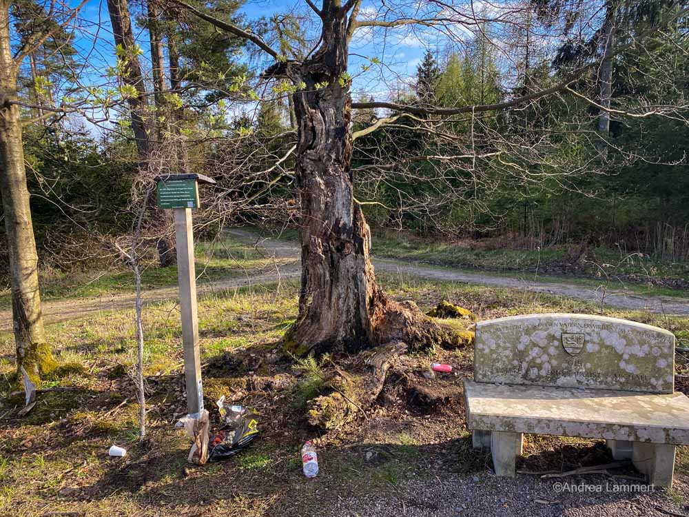 Wir fanden „Die Streitbuche“ (leider mit Unmengen Plastikmüll davor). Der Name Streitbuche kommt übrigens nicht von ungefähr, immer wieder kam es an diesem Ort zu Streitigkeiten, wem dieses Stück Land zuzurechnen sei: Der Stadt Springe, den Knigges oder Bredenbeck? 1850 soll sogar ein Förster, der für Knigges arbeitete, das Fällen der Buche verhindert haben und mit geladenem Gewehr darüber gewacht haben. Schließlich markierte der Baum ja den Grenzverlauf. Und wäre der Baum weg gewesen, hätte man die Grenze neu ziehen können. Deswegen also Streitbuche.