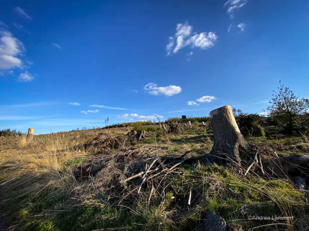 Doch nicht die Streitbuche ist es, die den Blick an dieser Stelle auf sich zieht, sondern der Ausblick. Mittlerweise befindet sich der Wanderer nämlich auf dem Kammweg des Deisters, also ganz oben auf unserem Berg, dessen höchste Erhebung übrigens der Bröhn (ganz im Westen des Deisters gelegen) mit seinen 405 Metern ist. Das Panorama ist wirklich wunderschön und dem Borkenkäfer sei leider Dank, kann man es jetzt auch voll genießen, denn diese Stelle des Deisters ist grade baumlos wie eine Alt-Herren-Glatze, auf der sich hin und wieder mal ein Haarstoppel verirrt hat, in diesem Fall ein Baumstumpen.