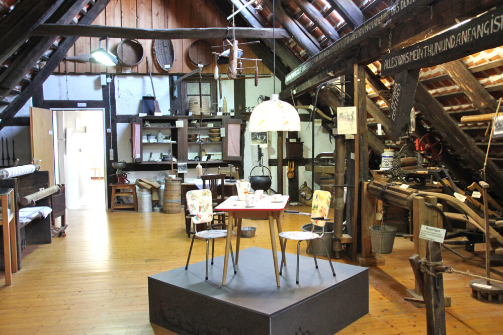 Die Entfernungen kann man hier eher in Minuten messen als in Stunden, ebenso, wie man Lokale eher an einer Hand abzählen kann. Beschaulich eben. Sehenswert ist auf jeden Fall auch das Pfarrhaus, auf dessen Dachboden es von Gegenständen nur so wimmelt, die direkt aus Max und Moritz entsprungen sein könnten: Sägeblättern, Webrahmen und Hexenkesseln über dem Feuer. Eine kleine, aber feine Dokumentation über die Lebensweise vor 200 Jahren.