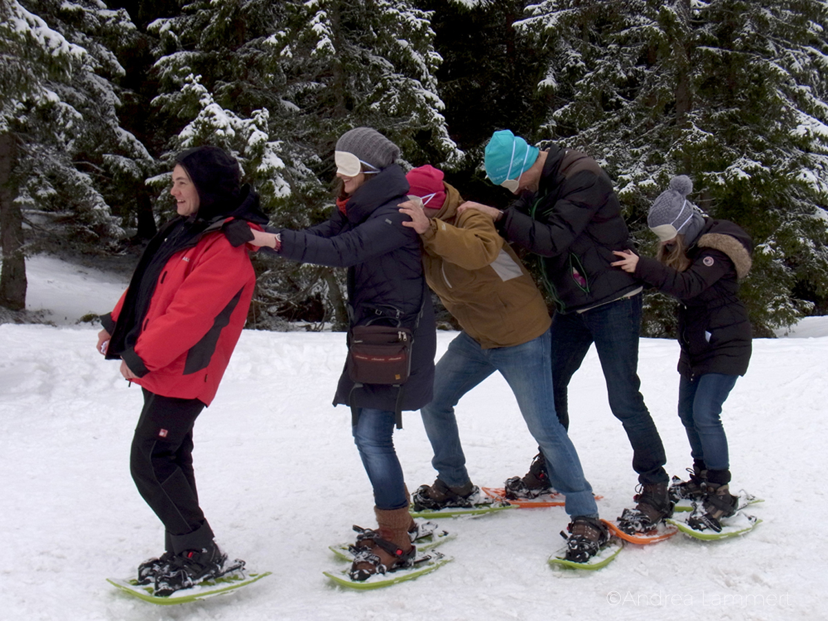 Zum Schluss hat Christine noch etwas Witziges für ihre Gruppe aus der Jugendherberge im Programm. Wir setzen die Schlafbrillen auf und formen eine Polonaise durch den Wald. Nur Christine schaut, sie führt uns dicht an Bäumen und Ästen entlang. Ich trete Katrin dauernd auf die Hacken. Doch irgendwann sind wir alle im Takt. So ist Schnee auch witzig.