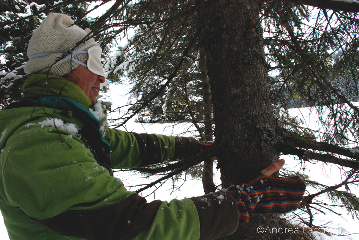 „Die setzt eine von Euch jetzt auf, und dann führt euch eure Partnerin zu einem Baum, den Ihr ertasten sollt.“ Und später wiedererkennen – das schaffe ich nie! Katrin führt mich bergab, das merke ich mir, zu einer Fichte, etwas anderes wächst hier nicht. Ich versuche mir die Dicke des Stammes einzuprägen und taste mich einfach weiter herab. Unten, bevor die Schneedecke beginnt, fühle ich eine Astspitze, ganz markant und geformt wie ein Dolch. Wir gehen zurück, Augenbinde ab. Ich schaue mich gründlich um – und finde tatsächlich meinen Baum.
