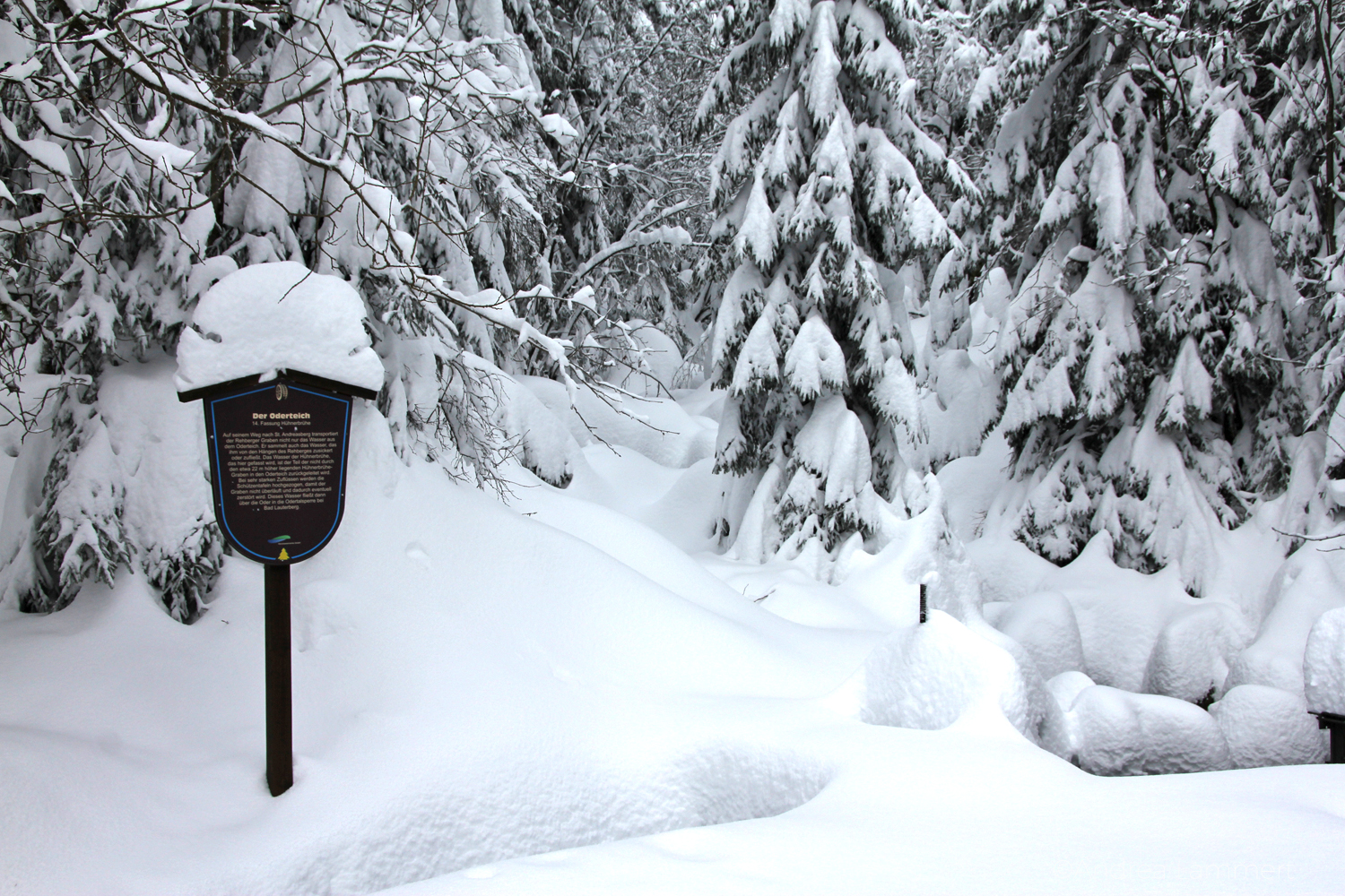 Es ist gar nicht so einfach, bei diesen Schneemassen die Hühnerbrühe zu finden, doch sie plätschert wohl an unserem Wegesrand entlang, wie wir den Schildern entnehmen. Und ein kleines Stückchen sehen wir sie auch einmal. Sie fließt in einem tiefen Graben neben unserem Weg, von Steinplatten abgedeckt und ist Teil des Weltkulturerbes Oberharzer Wasserregal. Was die Harzer da im 16. Jahrhundert angelegt haben, um die Maschinen in ihren Bergwerken per Wasserkraft anzutreiben, legt sich heute wie ein blaumaschiges Netz über den Harz. Überall plätschert es in Trögen, Kanälen oder kleinen Bächen. Ein wunderschöner Teil des Harzes.